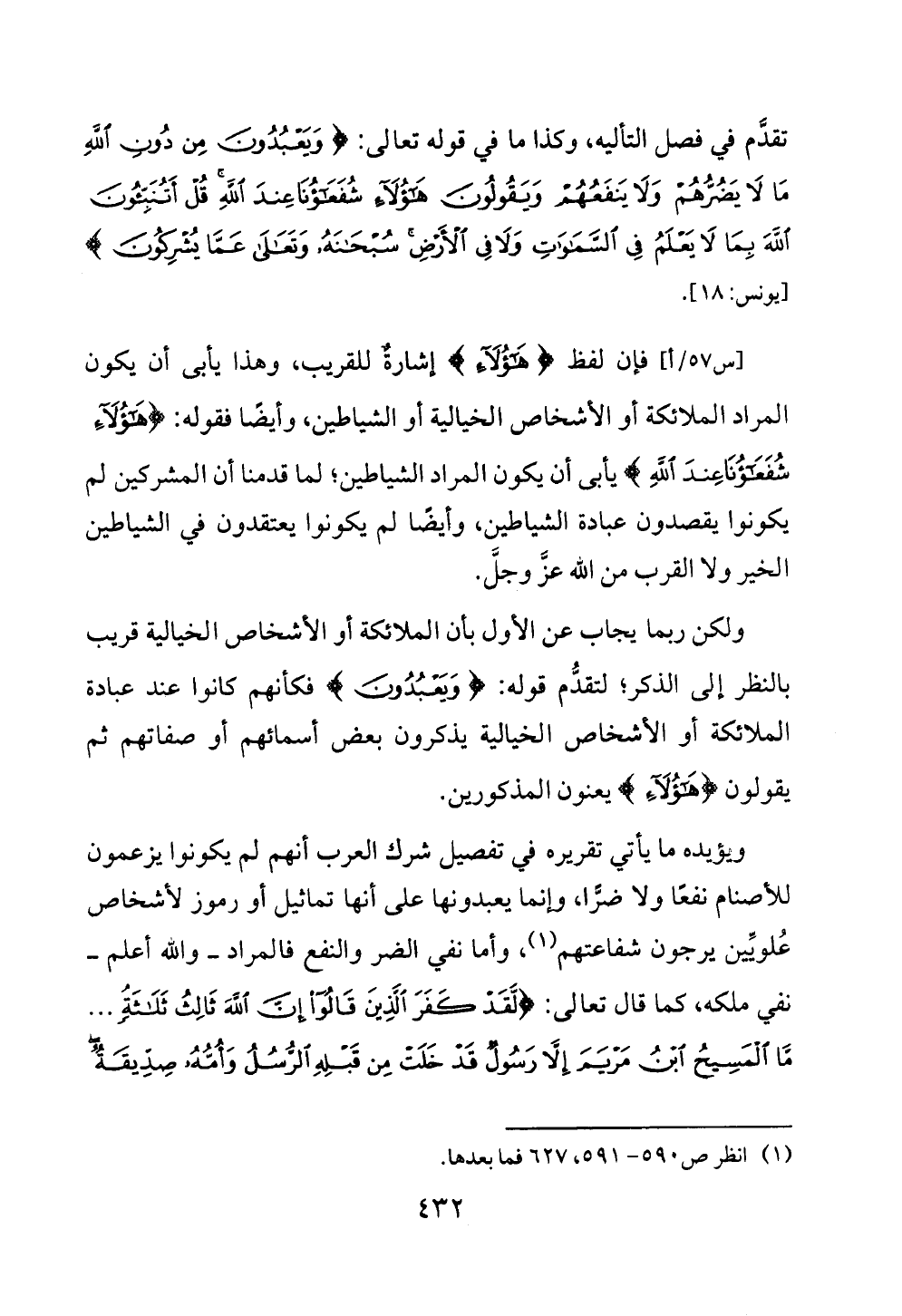 [س ٥٧/أ] فإن لفظ {هَؤُلَاءِ} إشارةٌ للقريب, وهذا يأبى أن يكون المراد الملائكة أو الأشخاص الخيالية أو الشياطين، وأيضًا فقوله: {هَؤُلَاءِ شُفَعَاؤُنَا عِنْدَ اللَّهِ} يأبى أن يكون المراد الشياطين؛ لما قدمنا أن المشركين لم يكونوا يقصدون عبادة الشياطين، وأيضًا لم يكونوا يعتقدون في الشياطين الخير ولا القرب من الله عزَّ وجلَّ.