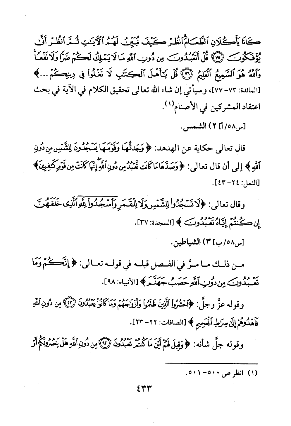 كَانَا يَأْكُلَانِ الطَّعَامَ انْظُرْ كَيْفَ نُبَيِّنُ لَهُمُ الْآيَاتِ ثُمَّ انْظُرْ أَنَّى يُؤْفَكُونَ (٧٥) قُلْ أَتَعْبُدُونَ مِنْ دُونِ اللَّهِ مَا لَا يَمْلِكُ لَكُمْ ضَرًّا وَلَا نَفْعًا وَاللَّهُ هُوَ السَّمِيعُ الْعَلِيمُ (٧٦) قُلْ يَاأَهْلَ الْكِتَابِ لَا تَغْلُوا فِي دِينِكُمْ ... } [المائدة: ٧٣ - ٧٧] , وسيأتي إن شاء الله تعالى تحقيق الكلام في الآية في بحث اعتقاد المشركين في الأصنام (¬١).