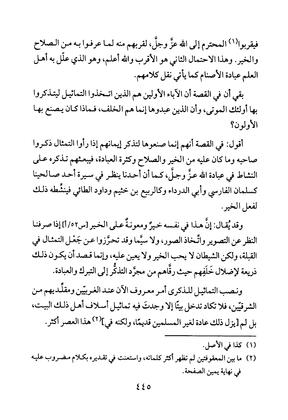 أقول: في القصة أنهم إنما صنعوها لتذكر إيمانهم إذا رأوا التمثال ذكروا صاحبه وما كان عليه من الخير والصلاح وكثرة العبادة, فيبعثهم تذكره على النشاط في عبادة الله عزَّ وجلَّ, كما أن أحدنا ينظر في سيرة أحد صالحينا كسلمان الفارسي وأبي الدرداء وكالربيع بن خثيم وداود الطائي فينشِّطه ذلك لفعل الخير.