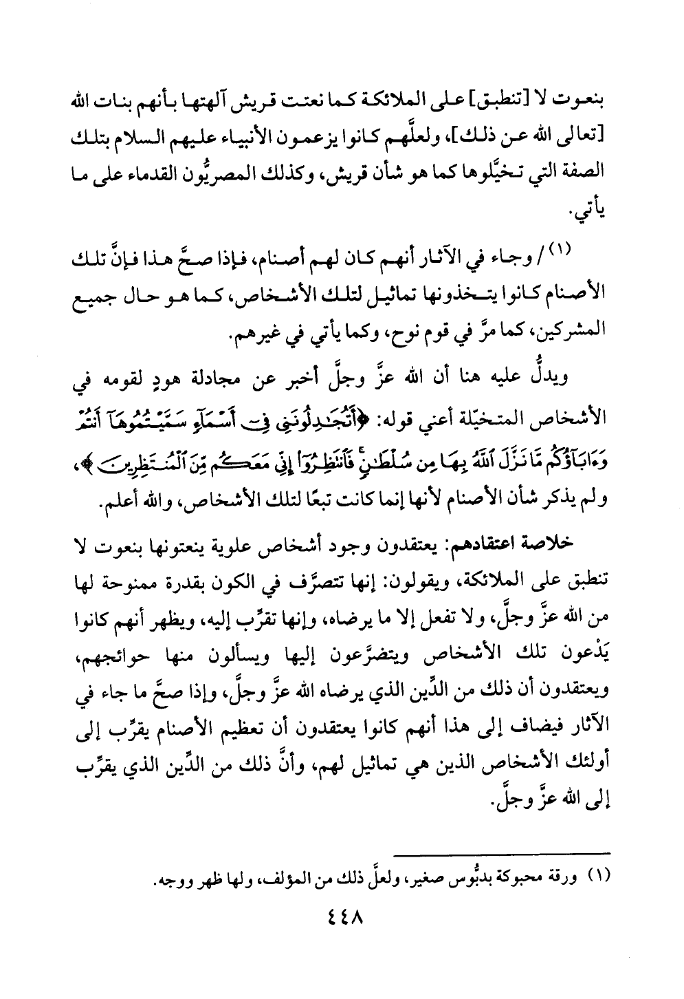 بنعوت لا [تنطبق] على الملائكة كما نعتت قريش آلهتها بأنهم بنات الله [تعالى الله عن ذلك] , ولعلَّهم كانوا يزعمون الأنبياء عليهم السلام بتلك الصفة التي تخيَّلوها كما هو شأن قريش، وكذلك المصريُّون القدماء على ما يأتي. (¬١) /وجاء في الآثار أنهم كان لهم أصنام، فإذا صحَّ هذا فإنَّ تلك الأصنام كانوا يتخذونها تماثيل لتلك الأشخاص، كما هو حال جميع المشركين، كما مرَّ في قوم نوح، وكما يأتي في غيرهم.