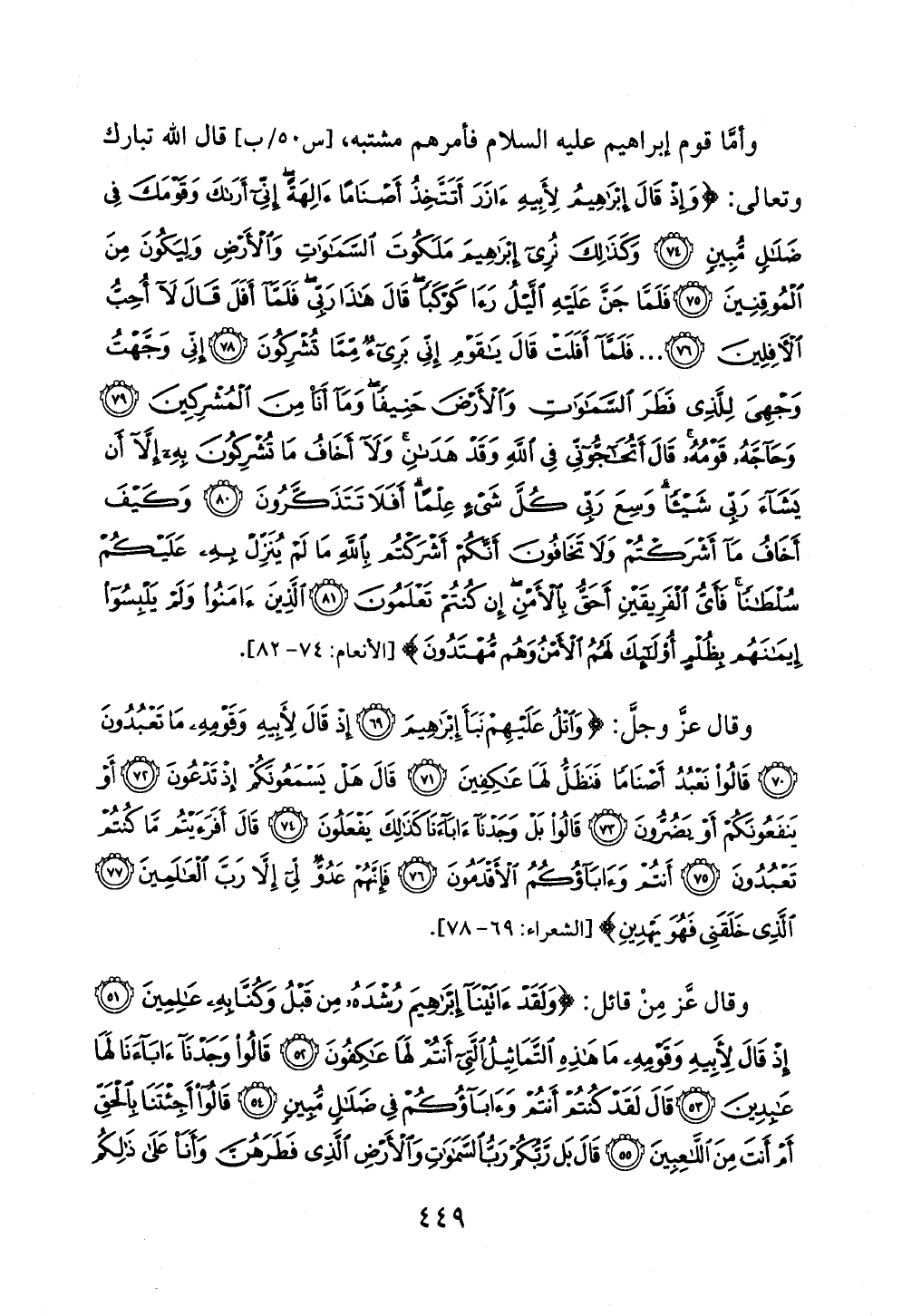 وقال عزَّ وجلَّ: {وَاتْلُ عَلَيْهِمْ نَبَأَ إِبْرَاهِيمَ (٦٩) إِذْ قَالَ لِأَبِيهِ وَقَوْمِهِ مَا تَعْبُدُونَ (٧٠) قَالُوا نَعْبُدُ أَصْنَامًا فَنَظَلُّ لَهَا عَاكِفِينَ (٧١) قَالَ هَلْ يَسْمَعُونَكُمْ إِذْ تَدْعُونَ (٧٢) أَوْ يَنْفَعُونَكُمْ أَوْ يَضُرُّونَ (٧٣) قَالُوا بَلْ وَجَدْنَا آبَاءَنَا كَذَلِكَ يَفْعَلُونَ (٧٤) قَالَ أَفَرَأَيْتُمْ مَا كُنْتُمْ تَعْبُدُونَ (٧٥) أَنْتُمْ وَآبَاؤُكُمُ الْأَقْدَمُونَ (٧٦) فَإِنَّهُمْ عَدُوٌّ لِي إِلَّا رَبَّ الْعَالَمِينَ (٧٧) الَّذِي خَلَقَنِي فَهُوَ يَهْدِينِ} [الشعراء: ٦٩ - ٧٨].