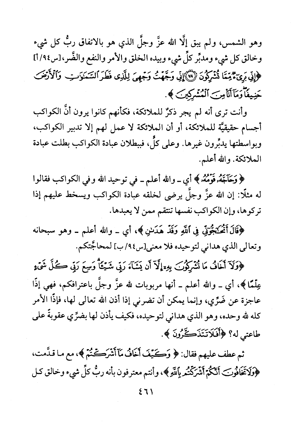 وهو الشمس، ولم يبق إلَّا الله عزَّ وجلَّ الذي هو بالاتفاق ربُّ كل شيء وخالق كل شيء ومدبِّر كلِّ شيء وبيده الخلق والأمر والنفع والضَّر, [س ٩٤/أ] {إِنِّي بَرِيءٌ مِمَّا تُشْرِكُونَ (٧٨) إِنِّي وَجَّهْتُ وَجْهِيَ لِلَّذِي فَطَرَ السَّمَاوَاتِ وَالْأَرْضَ حَنِيفًا وَمَا أَنَا مِنَ الْمُشْرِكِينَ}.