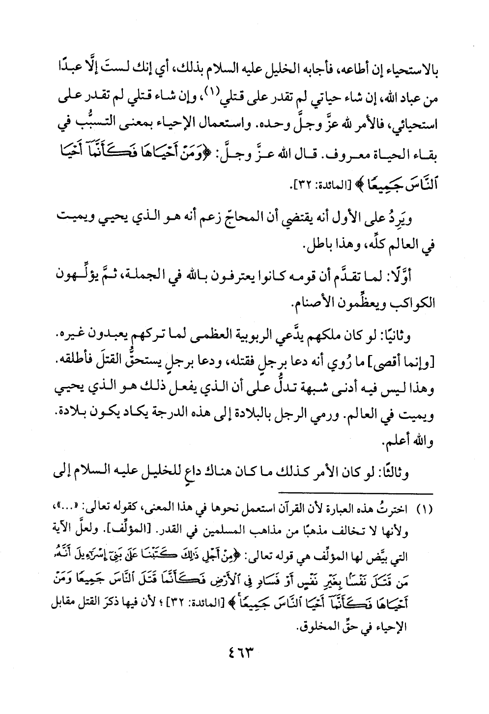 (¬١) اخترتُ هذه العبارة لأن القرآن استعمل نحوها في هذا المعنى، كقوله تعالى: " ... "، ولأنها لا تخالف مذهبًا من مذاهب المسلمين في القدر. [المؤلِّف]. ولعلَّ الآية التي بيَّض لها المؤلِّف هي قوله تعالى: {مِنْ أَجْلِ ذَلِكَ كَتَبْنَا عَلَى بَنِي إِسْرَائِيلَ أَنَّهُ مَنْ قَتَلَ نَفْسًا بِغَيْرِ نَفْسٍ أَوْ فَسَادٍ فِي الْأَرْضِ فَكَأَنَّمَا قَتَلَ النَّاسَ جَمِيعًا وَمَنْ أَحْيَاهَا فَكَأَنَّمَا أَحْيَا النَّاسَ جَمِيعًا} [المائدة: ٣٢]؛ لأن فيها ذكرَ القتل مقابل الإحياء في حقِّ المخلوق.