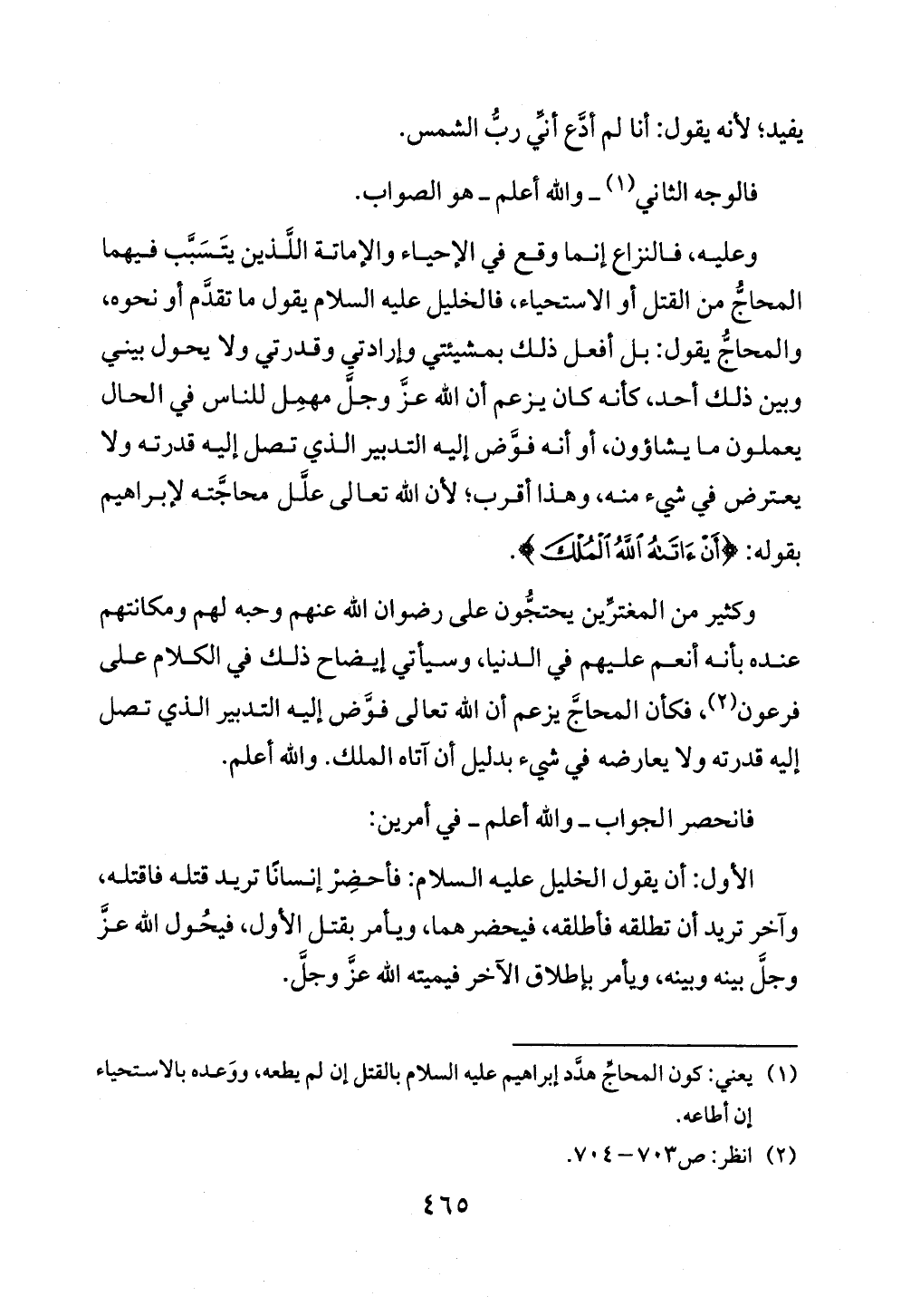 وعليه، فالنزاع إنما وقع في الإحياء والإماتة اللَّذين يتَسَبَّب فيهما المحاجُّ من القتل أو الاستحياء، فالخليل عليه السلام يقول ما تقدَّم أو نحوه، والمحاجُّ يقول: بل أفعل ذلك بمشيئتي وإرادتي وقدرتي ولا يحول بيني وبين ذلك أحد, كأنه كان يزعم أن الله عزَّ وجلَّ مهمِل للناس في الحال يعملون ما يشاؤون, أو أنه فوَّض إليه التدبير الذي تصل إليه قدرته ولا يعترض في شيء منه، وهذا أقرب؛ لأن الله تعالى علَّل محاجَّته لإبراهيم بقوله: {أَنْ آتَاهُ اللَّهُ الْمُلْكَ}.
