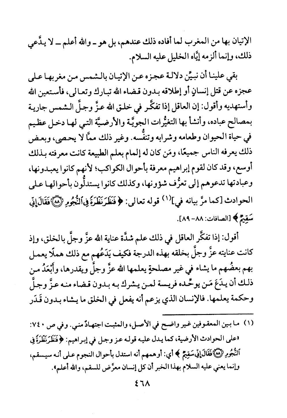 (¬١) ما بين المعقوفين غير واضح في الأصل، والمثبت اجتهادٌ مني. وفي ص ٧٤٠: "على الحوادث الأرضية, كما يدل عليه قوله عز وجل في إبراهيم: {فَنَظَرَ نَظْرَةً فِي النُّجُومِ (٨٨) فَقَالَ إِنِّي سَقِيمٌ} أي: أوهمهم أنه استدل بأحوال النجوم على أنه سيسقم, وإنما يعني عليه السلام بهذا الخبر أن كل إنسان معرَّض للسقم, والله أعلم".