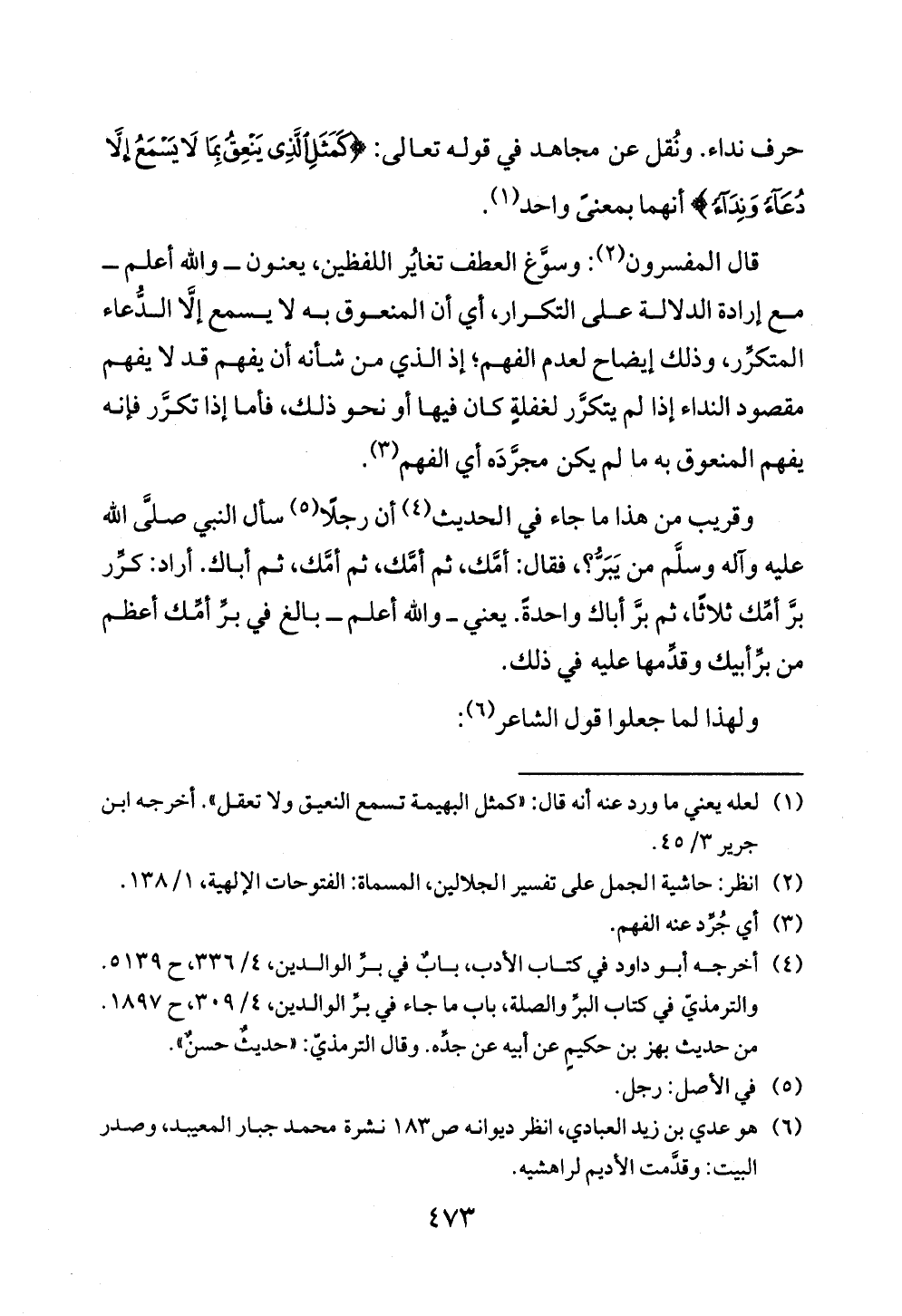 قال المفسرون (¬٢): وسوَّغ العطف تغايُر اللفظين، يعنون ــ والله أعلم ــ مع إرادة الدلالة على التكرار, أي أن المنعوق به لا يسمع إلَّا الدُّعاء المتكرِّر، وذلك إيضاح لعدم الفهم؛ إذ الذي من شأنه أن يفهم قد لا يفهم مقصود النداء إذا لم يتكرَّر لغفلةٍ كان فيها أو نحو ذلك، فأما إذا تكرَّر فإنه يفهم المنعوق به ما لم يكن مجرَّدَه أي الفهم (¬٣).
