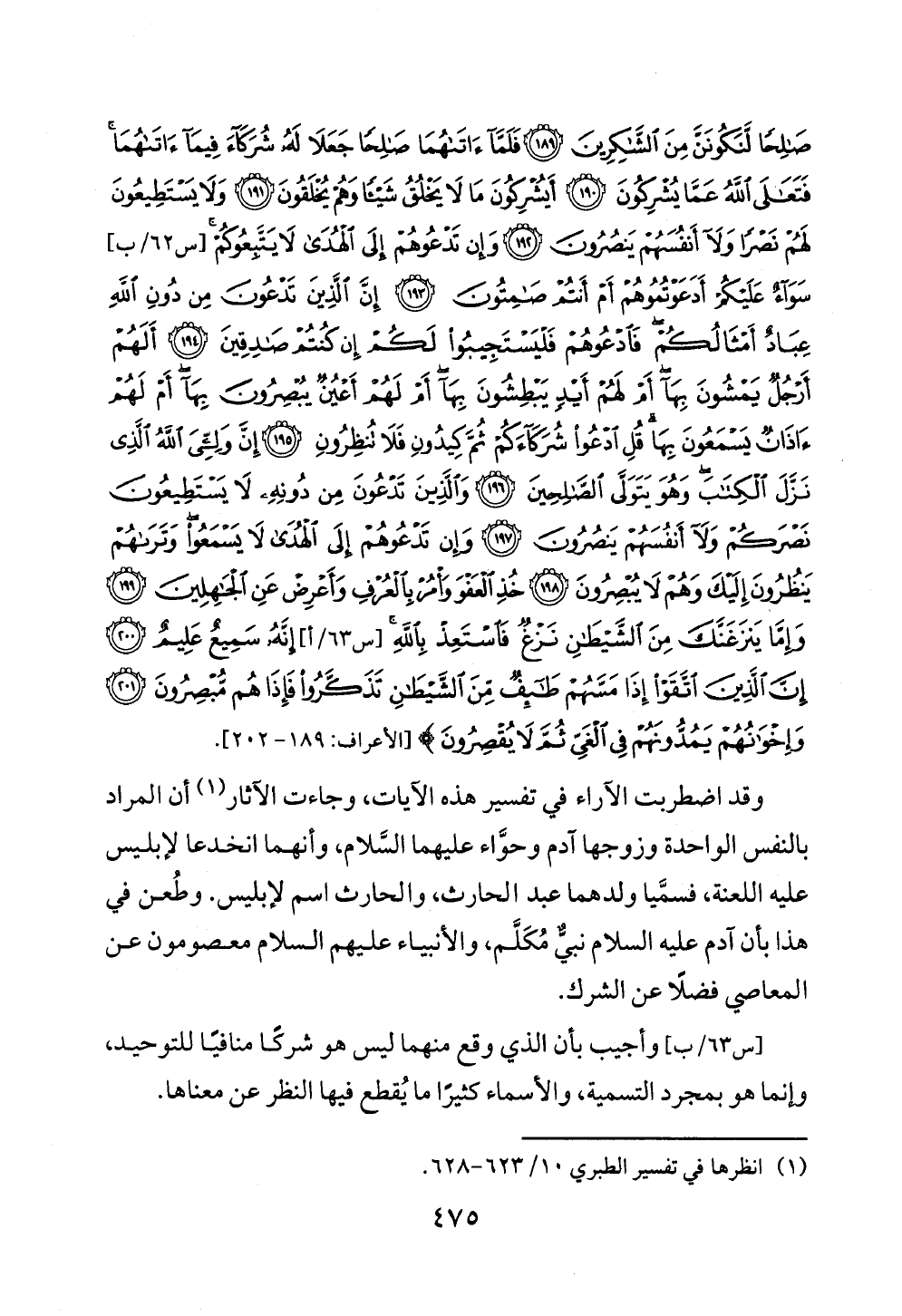 صَالِحًا لَنَكُونَنَّ مِنَ الشَّاكِرِينَ (١٨٩) فَلَمَّا آتَاهُمَا صَالِحًا جَعَلَا لَهُ شُرَكَاءَ فِيمَا آتَاهُمَا فَتَعَالَى اللَّهُ عَمَّا يُشْرِكُونَ (١٩٠) أَيُشْرِكُونَ مَا لَا يَخْلُقُ شَيْئًا وَهُمْ يُخْلَقُونَ (١٩١) وَلَا يَسْتَطِيعُونَ لَهُمْ نَصْرًا وَلَا أَنْفُسَهُمْ يَنْصُرُونَ (١٩٢) وَإِنْ تَدْعُوهُمْ إِلَى الْهُدَى لَا يَتَّبِعُوكُمْ [س ٦٢/ب] سَوَاءٌ عَلَيْكُمْ أَدَعَوْتُمُوهُمْ أَمْ أَنْتُمْ صَامِتُونَ (١٩٣) إِنَّ الَّذِينَ تَدْعُونَ مِنْ دُونِ اللَّهِ عِبَادٌ أَمْثَالُكُمْ فَادْعُوهُمْ فَلْيَسْتَجِيبُوا لَكُمْ إِنْ كُنْتُمْ صَادِقِينَ (١٩٤) أَلَهُمْ أَرْجُلٌ يَمْشُونَ بِهَا أَمْ لَهُمْ أَيْدٍ يَبْطِشُونَ بِهَا أَمْ لَهُمْ أَعْيُنٌ يُبْصِرُونَ بِهَا أَمْ لَهُمْ آذَانٌ يَسْمَعُونَ بِهَا قُلِ ادْعُوا شُرَكَاءَكُمْ ثُمَّ كِيدُونِ فَلَا تُنْظِرُونِ (١٩٥) إِنَّ وَلِيِّيَ اللَّهُ الَّذِي نَزَّلَ الْكِتَابَ وَهُوَ يَتَوَلَّى الصَّالِحِينَ (١٩٦) وَالَّذِينَ تَدْعُونَ مِنْ دُونِهِ لَا يَسْتَطِيعُونَ نَصْرَكُمْ وَلَا أَنْفُسَهُمْ يَنْصُرُونَ (١٩٧) وَإِنْ تَدْعُوهُمْ إِلَى الْهُدَى لَا يَسْمَعُوا وَتَرَاهُمْ يَنْظُرُونَ إِلَيْكَ وَهُمْ لَا يُبْصِرُونَ (١٩٨) خُذِ الْعَفْوَ وَأْمُرْ بِالْعُرْفِ وَأَعْرِضْ عَنِ الْجَاهِلِينَ (١٩٩) وَإِمَّا يَنْزَغَنَّكَ مِنَ الشَّيْطَانِ نَزْغٌ فَاسْتَعِذْ بِاللَّهِ [س ٦٣/أ] إِنَّهُ سَمِيعٌ عَلِيمٌ (٢٠٠) إِنَّ الَّذِينَ اتَّقَوْا إِذَا مَسَّهُمْ طَائِفٌ مِنَ الشَّيْطَانِ تَذَكَّرُوا فَإِذَا هُمْ مُبْصِرُونَ (٢٠١) وَإِخْوَانُهُمْ يَمُدُّونَهُمْ فِي الْغَيِّ ثُمَّ لَا يُقْصِرُونَ} [الأعراف: ١٨٩ - ٢٠٢].