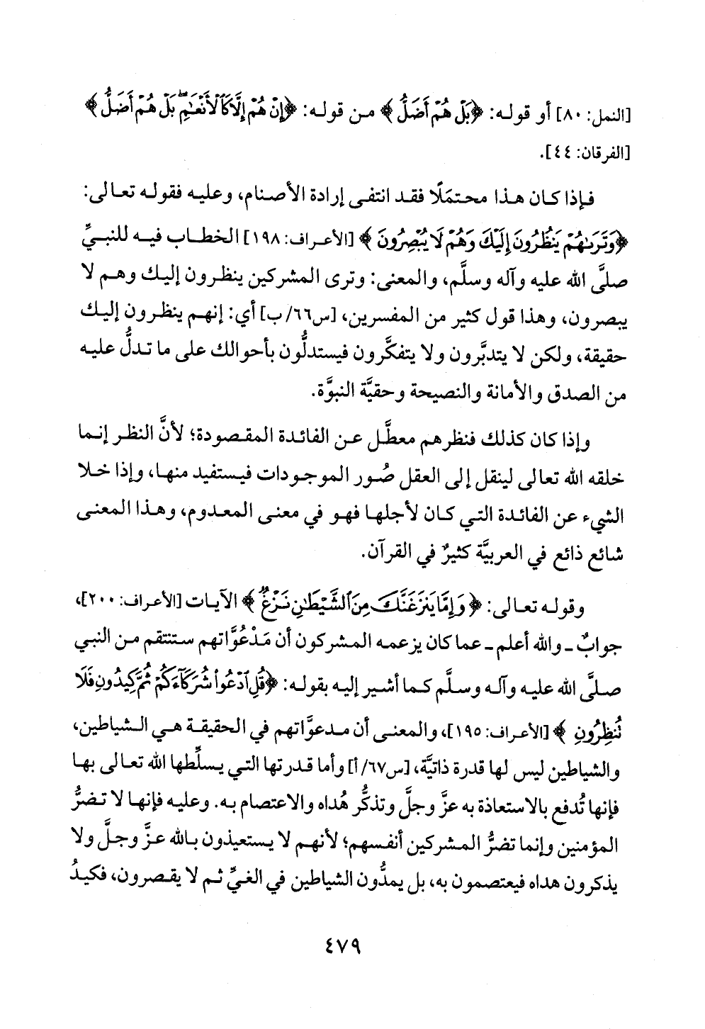 فإذا كان هذا محتمَلًا فقد انتفى إرادة الأصنام، وعليه فقوله تعالى: {وَتَرَاهُمْ يَنْظُرُونَ إِلَيْكَ وَهُمْ لَا يُبْصِرُونَ} [الأعراف: ١٩٨] الخطاب فيه للنبيِّ صلَّى الله عليه وآله وسلَّم، والمعنى: وترى المشركين ينظرون إليك وهم لا يبصرون، وهذا قول كثير من المفسرين، [س ٦٦/ب] أي: إنهم ينظرون إليك حقيقة، ولكن لا يتدبَّرون ولا يتفكَّرون فيستدلُّون بأحوالك على ما تدلُّ عليه من الصدق والأمانة والنصيحة وحقيَّة النبوَّة.