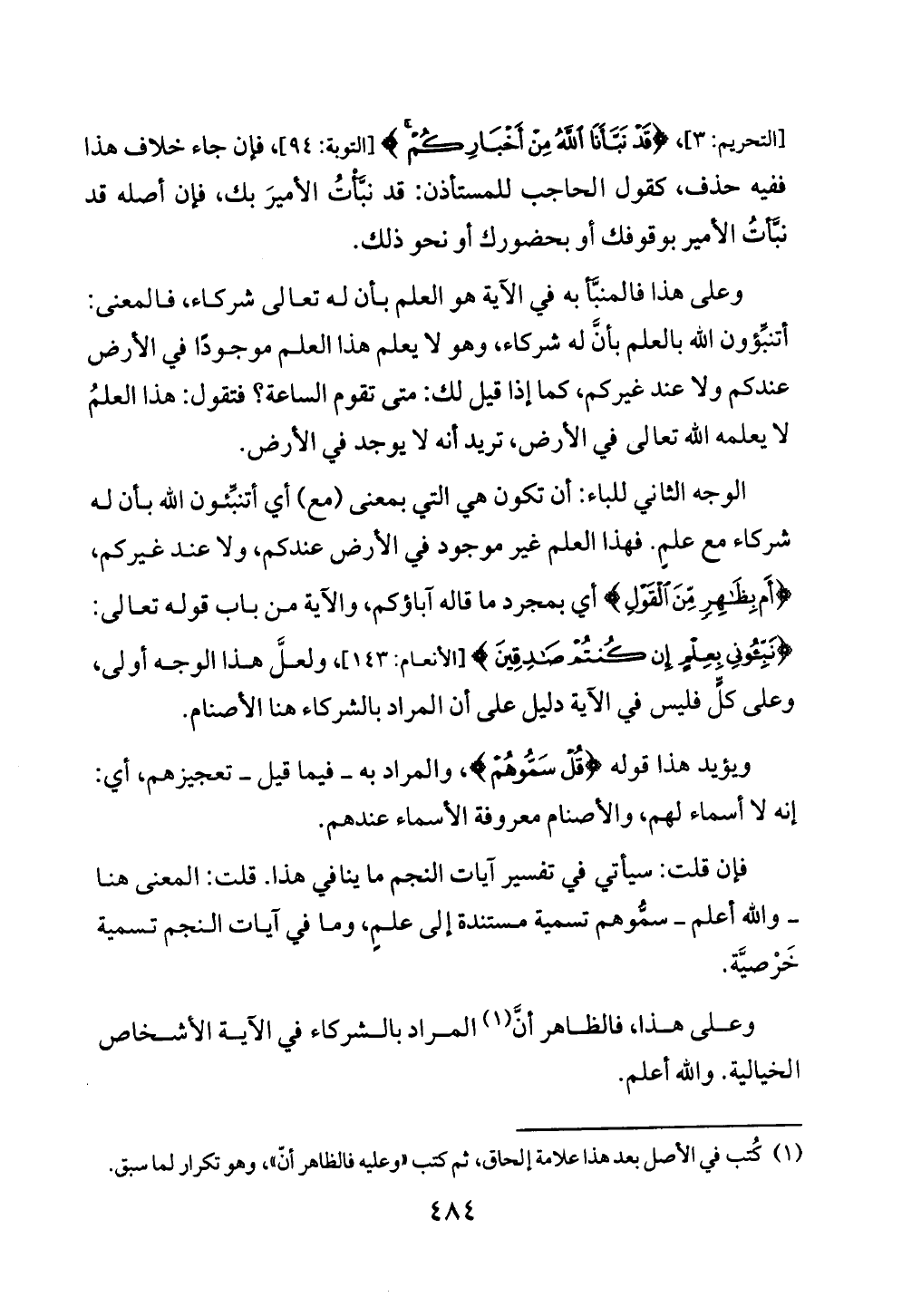 فإن قلت: سيأتي في تفسير آيات النجم ما ينافي هذا. قلت: المعنى هنا ــ والله أعلم ــ سمُّوهم تسمية مستندة إلى علمٍ، وما في آيات النجم تسمية خَرْصيَّة.