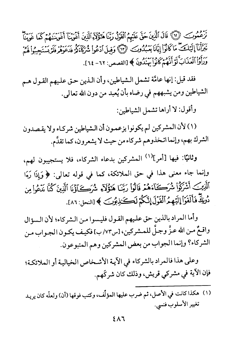 وأما المراد بالذين حق عليهم القول فليسوا من الشركاء؛ لأن السؤال واقعٌ من الله عزَّ وجلَّ للمشركين، [س ٧٣/ب] فكيف يكون الجواب من الشركاء؟ وإنما الجواب من بعض المشركين وهم المتبوعون.