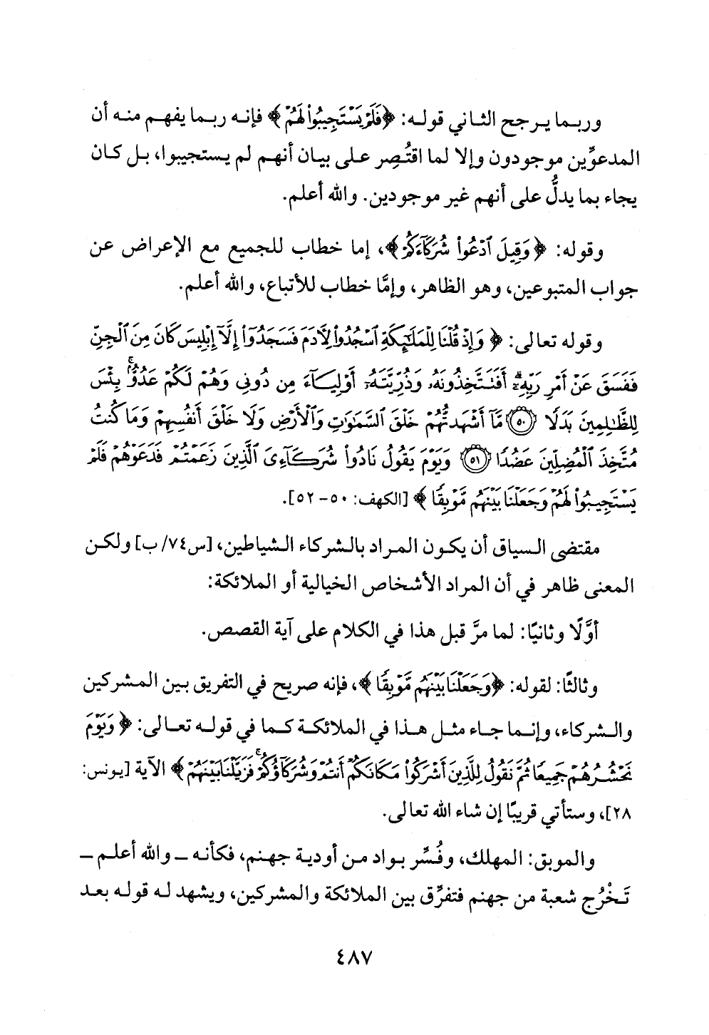 مقتضى السياق أن يكون المراد بالشركاء الشياطين، [س ٧٤/ب] ولكن المعنى ظاهر في أن المراد الأشخاص الخيالية أو الملائكة: