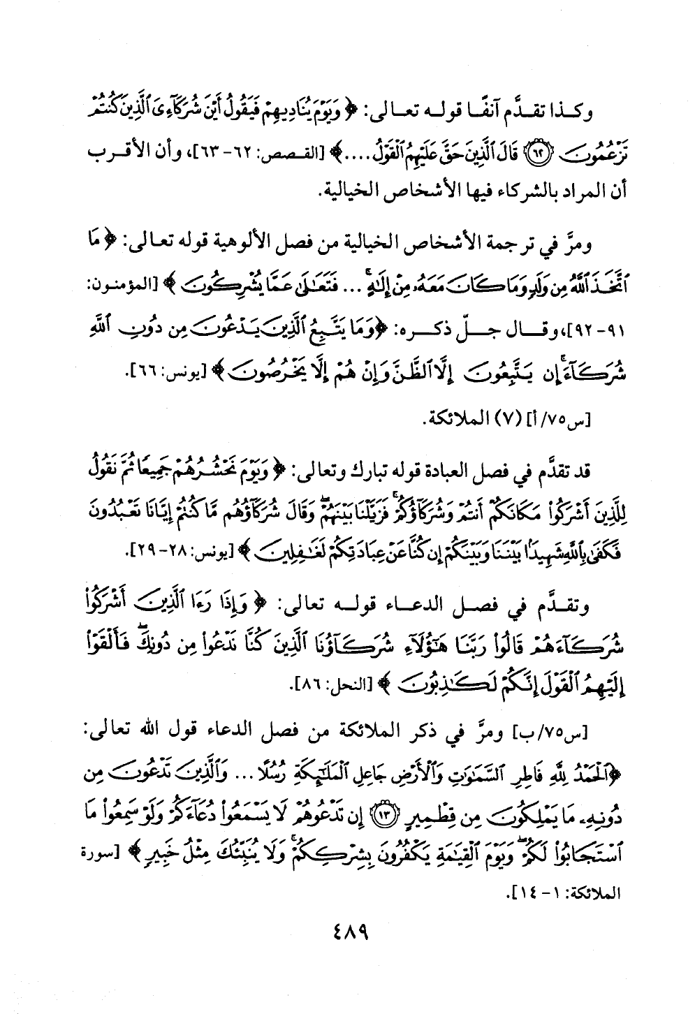 ومرَّ في ترجمة الأشخاص الخيالية من فصل الألوهية قوله تعالى: {مَا اتَّخَذَ اللَّهُ مِنْ وَلَدٍ وَمَا كَانَ مَعَهُ مِنْ إِلَهٍ ... فَتَعَالَى عَمَّا يُشْرِكُونَ} [المؤمنون: ٩١ - ٩٢]، وقال جلّ ذكره: {وَمَا يَتَّبِعُ الَّذِينَ يَدْعُونَ مِنْ دُونِ اللَّهِ شُرَكَاءَ إِنْ يَتَّبِعُونَ إِلَّا الظَّنَّ وَإِنْ هُمْ إِلَّا يَخْرُصُونَ} [يونس: ٦٦].