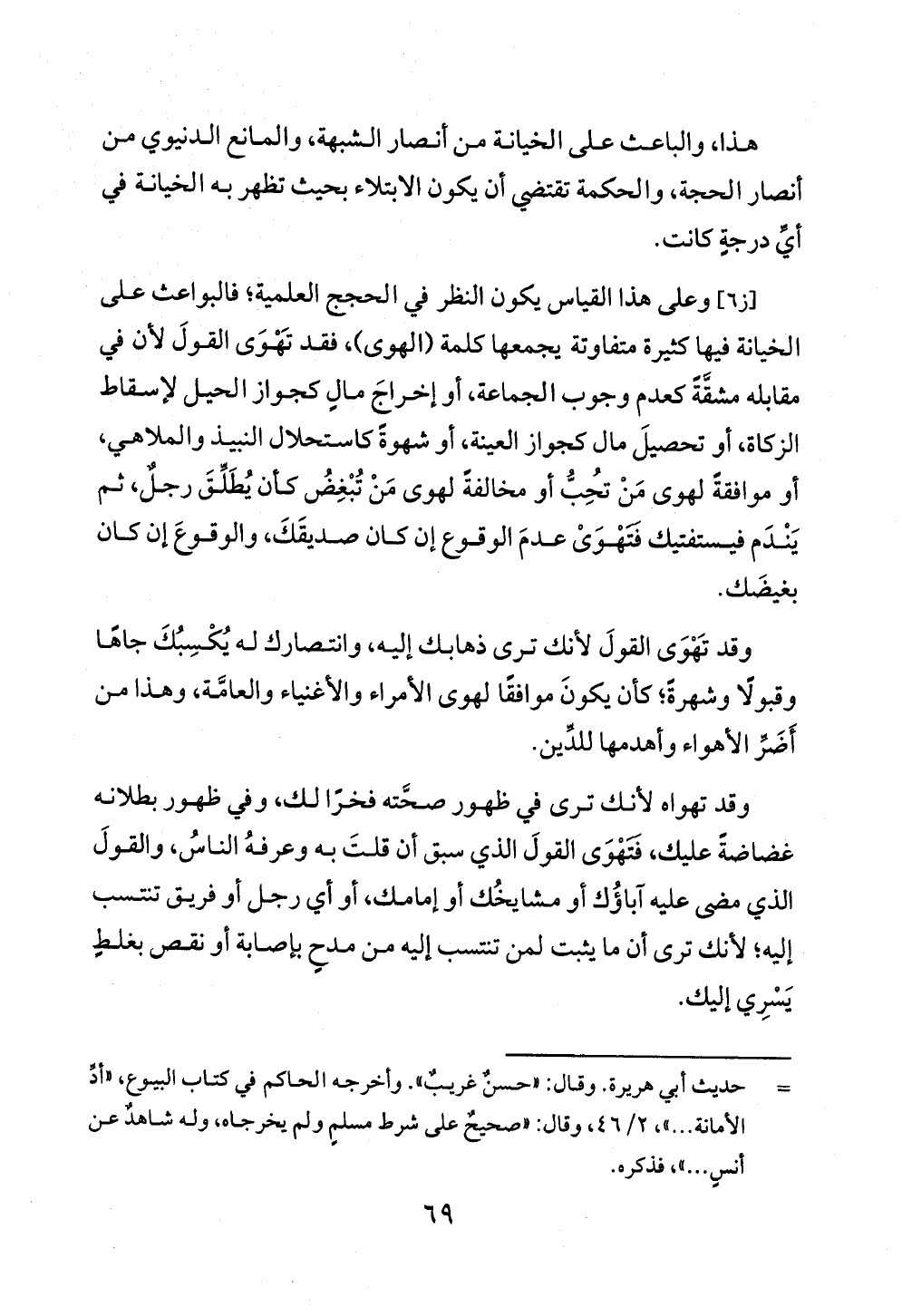 [ز ٦] وعلى هذا القياس يكون النظر في الحجج العلمية؛ فالبواعث على الخيانة فيها كثيرة متفاوتة يجمعها كلمة (الهوى)، فقد تَهْوَى القولَ لأن في مقابله مشقَّةً كعدم وجوب الجماعة، أو إخراجَ مالٍ كجواز الحيل لإسقاط الزكاة، أو تحصيلَ مال كجواز العينة، أو شهوةً كاستحلال النبيذ والملاهي، أو موافقةً لهوى مَنْ تُحِبُّ أو مخالفةً لهوى مَنْ تُبْغِضُ كأن يُطَلِّقَ رجلٌ، ثم يَنْدَم فيستفتيك فَتَهْوَىْ عدمَ الوقوع إن كان صديقَكَ، والوقوعَ إن كان بغيضَك.