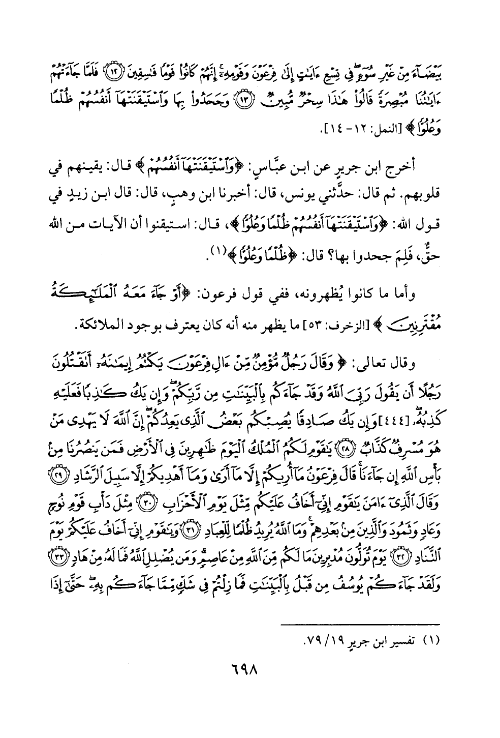 أخرج ابن جريرٍ عن ابن عبَّاسٍ: {وَاسْتَيْقَنَتْهَا أَنْفُسُهُمْ} قال: يقينهم في قلوبهم. ثم قال: حدَّثني يونس، قال: أخبرنا ابن وهبٍ، قال: قال ابن زيدٍ في قول الله: {وَاسْتَيْقَنَتْهَا أَنْفُسُهُمْ ظُلْمًا وَعُلُوًّا}، قال: استيقنوا أن الآيات من الله حقٌّ، فَلِمَ جحدوا بها؟ قال: {ظُلْمًا وَعُلُوًّا} (¬١).