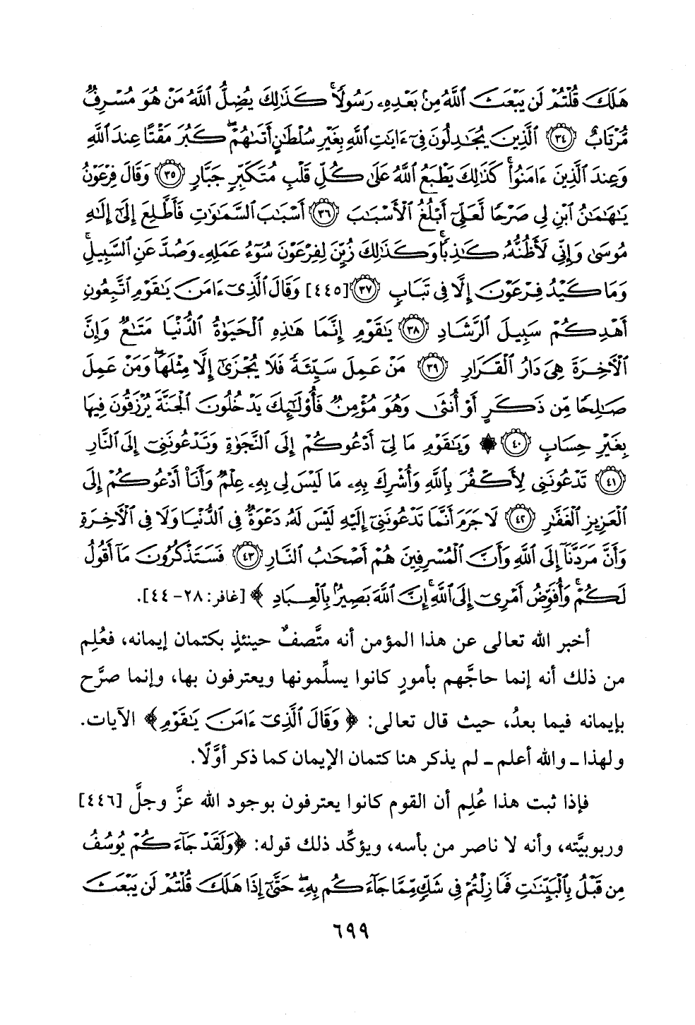 هَلَكَ قُلْتُمْ لَنْ يَبْعَثَ اللَّهُ مِنْ بَعْدِهِ رَسُولًا كَذَلِكَ يُضِلُّ اللَّهُ مَنْ هُوَ مُسْرِفٌ مُرْتَابٌ (٣٤) الَّذِينَ يُجَادِلُونَ فِي آيَاتِ اللَّهِ بِغَيْرِ سُلْطَانٍ أَتَاهُمْ كَبُرَ مَقْتًا عِنْدَ اللَّهِ وَعِنْدَ الَّذِينَ آمَنُوا كَذَلِكَ يَطْبَعُ اللَّهُ عَلَى كُلِّ قَلْبِ مُتَكَبِّرٍ جَبَّارٍ (٣٥) وَقَالَ فِرْعَوْنُ يَاهَامَانُ ابْنِ لِي صَرْحًا لَعَلِّي أَبْلُغُ الْأَسْبَابَ (٣٦) أَسْبَابَ السَّمَاوَاتِ فَأَطَّلِعَ إِلَى إِلَهِ مُوسَى وَإِنِّي لَأَظُنُّهُ كَاذِبًا وَكَذَلِكَ زُيِّنَ لِفِرْعَوْنَ سُوءُ عَمَلِهِ وَصُدَّ عَنِ السَّبِيلِ وَمَا كَيْدُ فِرْعَوْنَ إِلَّا فِي تَبَابٍ (٣٧) [٤٤٥] وَقَالَ الَّذِي آمَنَ يَاقَوْمِ اتَّبِعُونِ أَهْدِكُمْ سَبِيلَ الرَّشَادِ (٣٨) يَاقَوْمِ إِنَّمَا هَذِهِ الْحَيَاةُ الدُّنْيَا مَتَاعٌ وَإِنَّ الْآخِرَةَ هِيَ دَارُ الْقَرَارِ (٣٩) مَنْ عَمِلَ سَيِّئَةً فَلَا يُجْزَى إِلَّا مِثْلَهَا وَمَنْ عَمِلَ صَالِحًا مِنْ ذَكَرٍ أَوْ أُنْثَى وَهُوَ مُؤْمِنٌ فَأُولَئِكَ يَدْخُلُونَ الْجَنَّةَ يُرْزَقُونَ فِيهَا بِغَيْرِ حِسَابٍ (٤٠) وَيَاقَوْمِ مَا لِي أَدْعُوكُمْ إِلَى النَّجَاةِ وَتَدْعُونَنِي إِلَى النَّارِ (٤١) تَدْعُونَنِي لِأَكْفُرَ بِاللَّهِ وَأُشْرِكَ بِهِ مَا لَيْسَ لِي بِهِ عِلْمٌ وَأَنَا أَدْعُوكُمْ إِلَى الْعَزِيزِ الْغَفَّارِ (٤٢) لَا جَرَمَ أَنَّمَا تَدْعُونَنِي إِلَيْهِ لَيْسَ لَهُ دَعْوَةٌ فِي الدُّنْيَا وَلَا فِي الْآخِرَةِ وَأَنَّ مَرَدَّنَا إِلَى اللَّهِ وَأَنَّ الْمُسْرِفِينَ هُمْ أَصْحَابُ النَّارِ (٤٣) فَسَتَذْكُرُونَ مَا أَقُولُ لَكُمْ وَأُفَوِّضُ أَمْرِي إِلَى اللَّهِ إِنَّ اللَّهَ بَصِيرٌ بِالْعِبَادِ} [غافر: ٢٨ - ٤٤].
