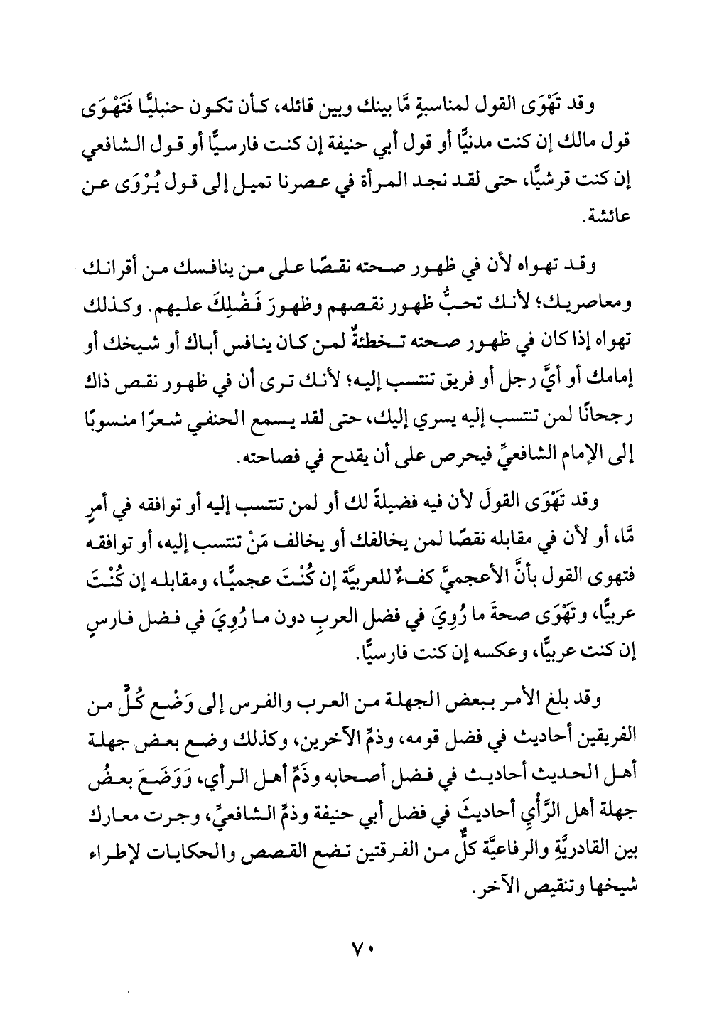 وقد تَهْوَى القول لمناسبةٍ مَّا بينك وبين قائله، كأن تكون حنبليًّا فَتَهْوَى قول مالك إن كنت مدنيًّا أو قول أبي حنيفة إن كنت فارسيًّا أو قول الشافعي إن كنت قرشيًّا، حتى لقد نجد المرأة في عصرنا تميل إلى قول يُرْوَى عن عائشة.