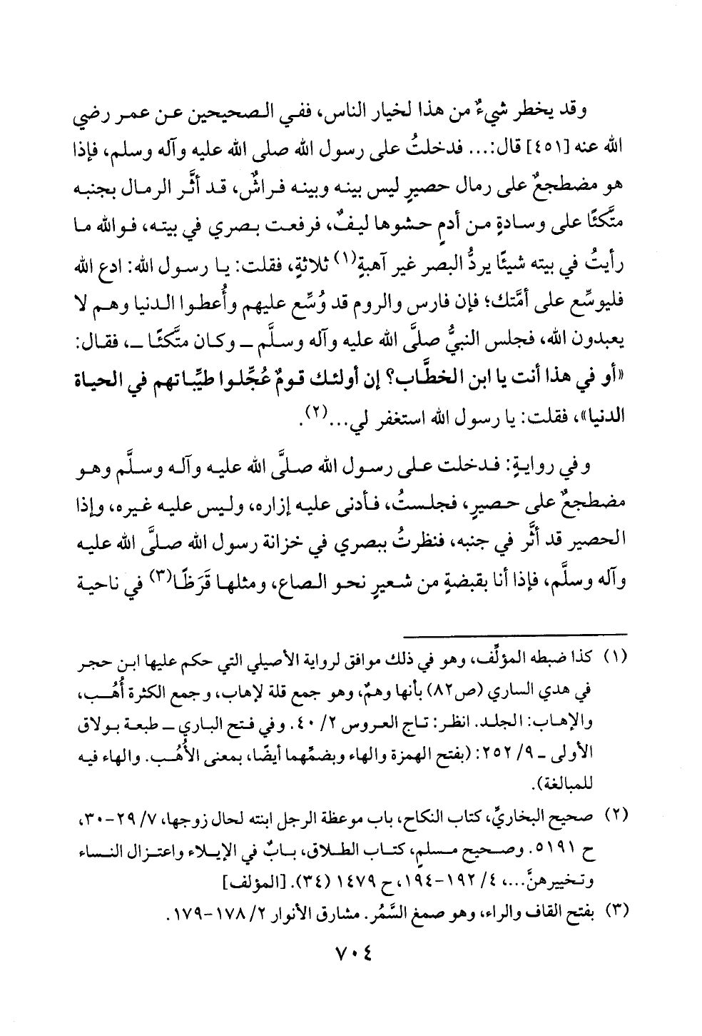 وقد يخطر شيءٌ من هذا لخيار الناس، ففي الصحيحين عن عمر رضي الله عنه [٤٥١] قال: ... فدخلتُ على رسول الله صلى الله عليه وآله وسلم، فإذا هو مضطجعٌ على رمال حصيرٍ ليس بينه وبينه فراشٌ، قد أثَّر الرمال بجنبه متَّكئًا على وسادةٍ من أدمٍ حشوها ليفٌ، فرفعت بصري في بيته، فوالله ما رأيتُ في بيته شيئًا يردُّ البصر غير آهبةٍ (¬١) ثلاثةٍ، فقلت: يا رسول الله: ادع الله فليوسِّع على أمَّتك؛ فإن فارس والروم قد وُسِّع عليهم وأُعطوا الدنيا وهم لا يعبدون الله، فجلس النبيُّ صلَّى الله عليه وآله وسلَّم ــ وكان متَّكئًا ــ، فقال: «أو في هذا أنت يا ابن الخطَّاب؟ إن أولئك قومٌ عُجِّلوا طيِّباتهم في الحياة الدنيا»، فقلت: يا رسول الله استغفر لي ... (¬٢).