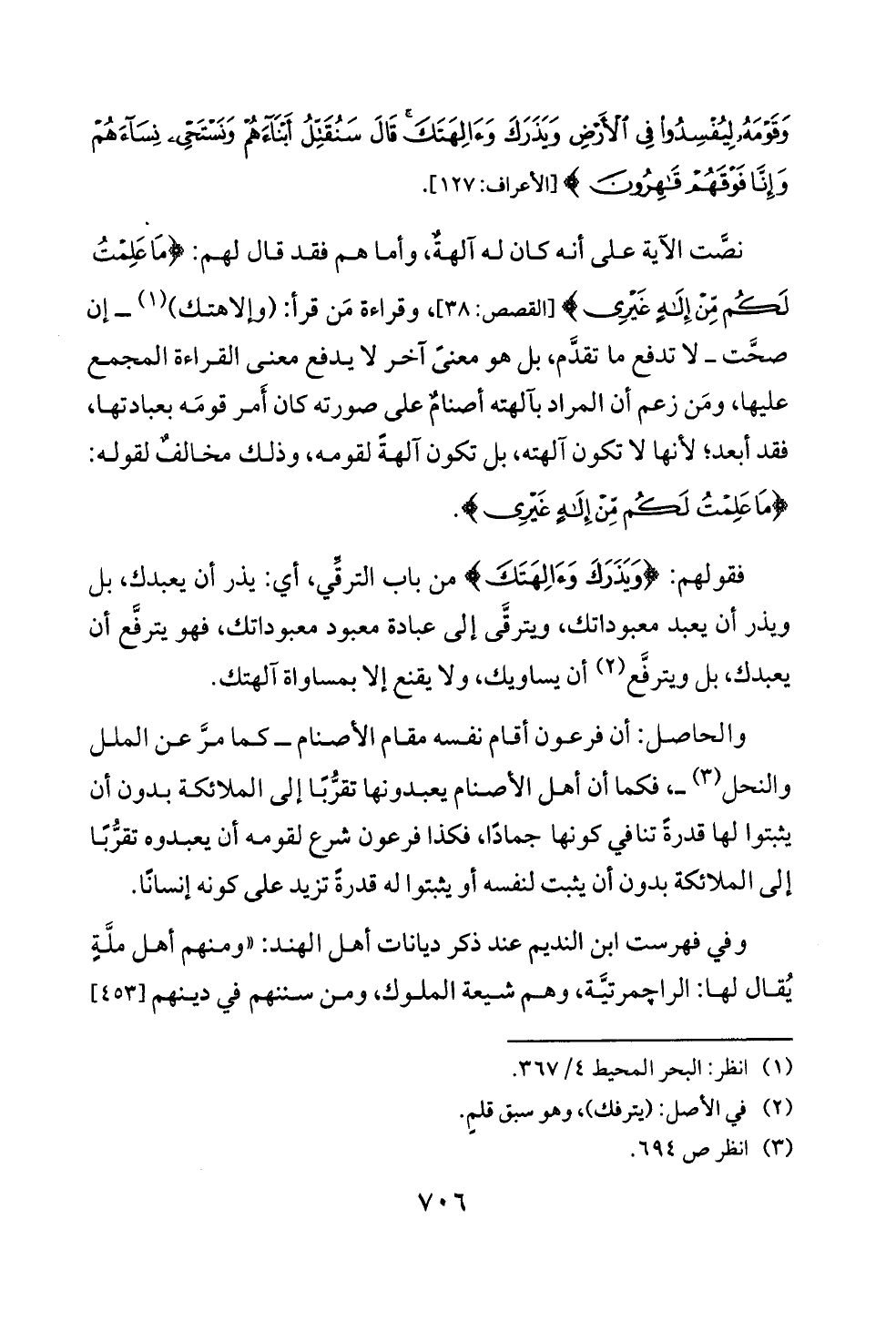 نصَّت الآية على أنه كان له آلهةٌ، وأما هم فقد قال لهم: {مَا عَلِمْتُ لَكُمْ مِنْ إِلَهٍ غَيْرِي} [القصص: ٣٨]، وقراءة مَن قرأ: (وإلاهتك) (¬١) ــ إن صحَّت ــ لا تدفع ما تقدَّم، بل هو معنىً آخر لا يدفع معنى القراءة المجمع عليها، ومَن زعم أن المراد بآلهته أصنامٌ على صورته كان أَمر قومَه بعبادتها، فقد أبعد؛ لأنها لا تكون آلهته، بل تكون آلهةً لقومه، وذلك مخالفٌ لقوله: {مَا عَلِمْتُ لَكُمْ مِنْ إِلَهٍ غَيْرِي}.