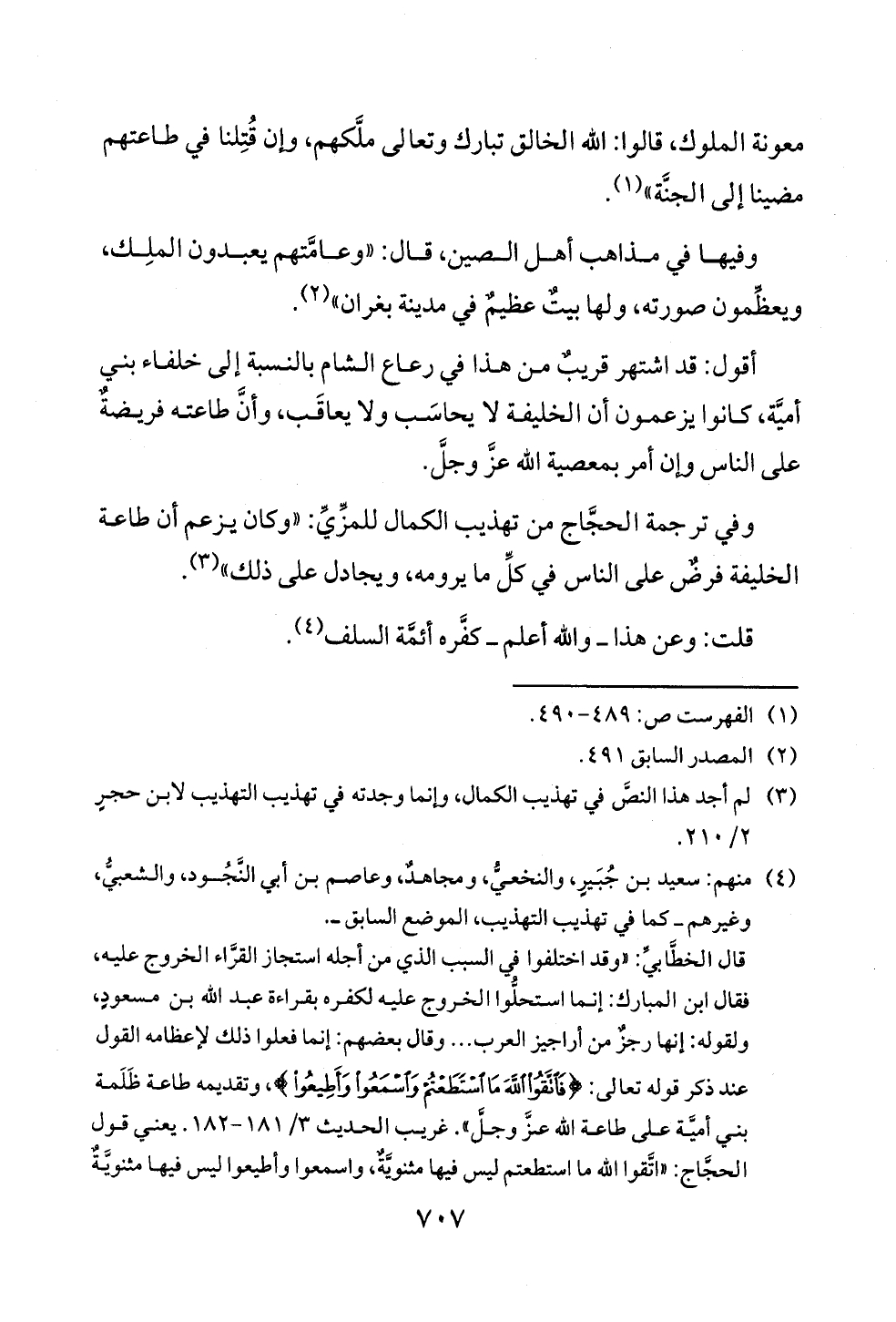 وفي ترجمة الحجَّاج من تهذيب الكمال للمزِّيِّ: «وكان يزعم أن طاعة الخليفة فرضٌ على الناس في كلِّ ما يرومه، ويجادل على ذلك» (¬٣).