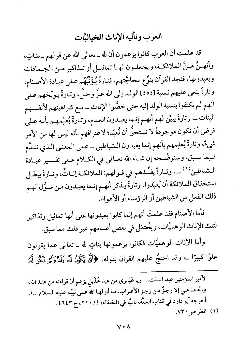 وأما الإناث الوهميَّات فكانوا يزعمونها بناتٍ لله ــ تعالى عما يقولون علوًا كبيرًا ــ، وقد احتجَّ عليهم القرآن بقوله: {أَنَّى يَكُونُ لَهُ وَلَدٌ وَلَمْ تَكُنْ لَهُ