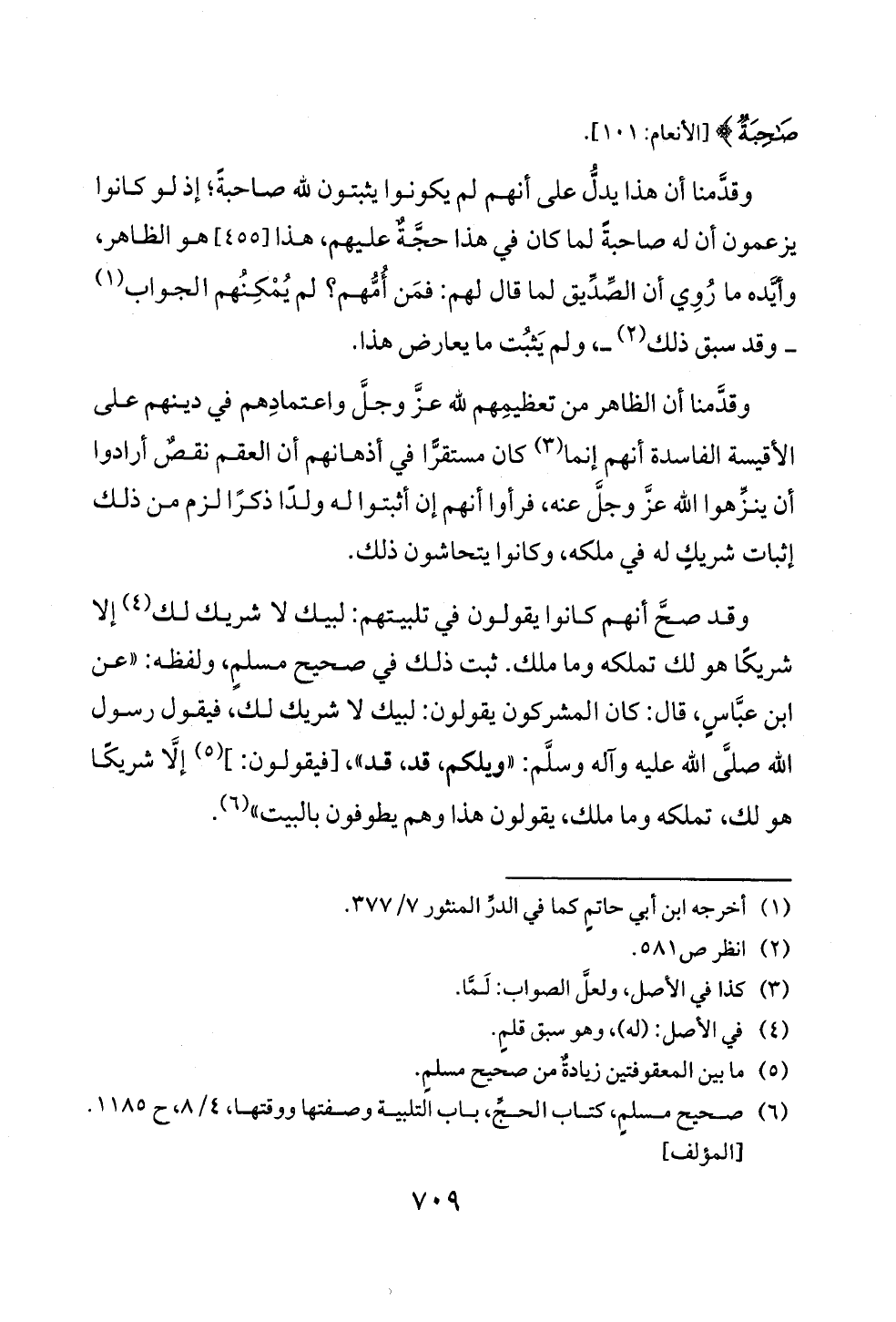 وقد صحَّ أنهم كانوا يقولون في تلبيتهم: لبيك لا شريك لك (¬٤) إلا شريكًا هو لك تملكه وما ملك. ثبت ذلك في صحيح مسلمٍ، ولفظه: «عن ابن عبَّاسٍ، قال: كان المشركون يقولون: لبيك لا شريك لك، فيقول رسول الله صلَّى الله عليه وآله وسلَّم: «ويلكم، قد، قد»، [فيقولون: ] (¬٥) إلَّا شريكًا هو لك، تملكه وما ملك، يقولون هذا وهم يطوفون بالبيت» (¬٦).