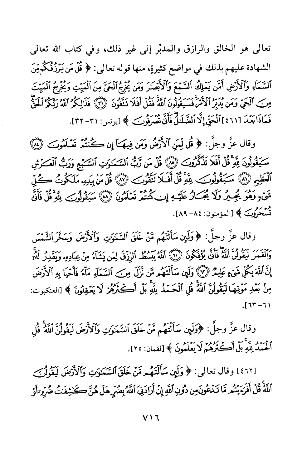 وقال عزَّ وجلَّ: {وَلَئِنْ سَأَلْتَهُمْ مَنْ خَلَقَ السَّمَاوَاتِ وَالْأَرْضَ وَسَخَّرَ الشَّمْسَ وَالْقَمَرَ لَيَقُولُنَّ اللَّهُ فَأَنَّى يُؤْفَكُونَ (٦١) اللَّهُ يَبْسُطُ الرِّزْقَ لِمَنْ يَشَاءُ مِنْ عِبَادِهِ وَيَقْدِرُ لَهُ إِنَّ اللَّهَ بِكُلِّ شَيْءٍ عَلِيمٌ (٦٢) وَلَئِنْ سَأَلْتَهُمْ مَنْ نَزَّلَ مِنَ السَّمَاءِ مَاءً فَأَحْيَا بِهِ الْأَرْضَ مِنْ بَعْدِ مَوْتِهَا لَيَقُولُنَّ اللَّهُ قُلِ الْحَمْدُ لِلَّهِ بَلْ أَكْثَرُهُمْ لَا يَعْقِلُونَ} [العنكبوت: ٦١ - ٦٣].