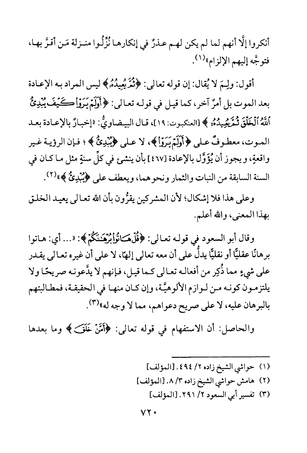 أقول: ولِمَ لا يُقال: إن قوله تعالى: {ثُمَّ يُعِيدُهُ} ليس المراد به الإعادة بعد الموت بل أمرٌ آخر، كما قيل في قوله تعالى: {أَوَلَمْ يَرَوْا كَيْفَ يُبْدِئُ اللَّهُ الْخَلْقَ ثُمَّ يُعِيدُهُ} [العنكبوت: ١٩] , قال البيضاويُّ: «إخبارٌ بالإعادة بعد الموت، معطوفٌ على {أَوَلَمْ يَرَوْا}، لا على {يُبْدِئُ}؛ فإن الرؤية غير واقعةٍ، ويجوز أن يُؤَوَّل بالإعادة [٤٦٧] بأن ينشئ في كلِّ سنةٍ مثل ما كان في السنة السابقة من النبات والثمار ونحوهما، ويعطف على {يُبْدِئُ}» (¬٢).