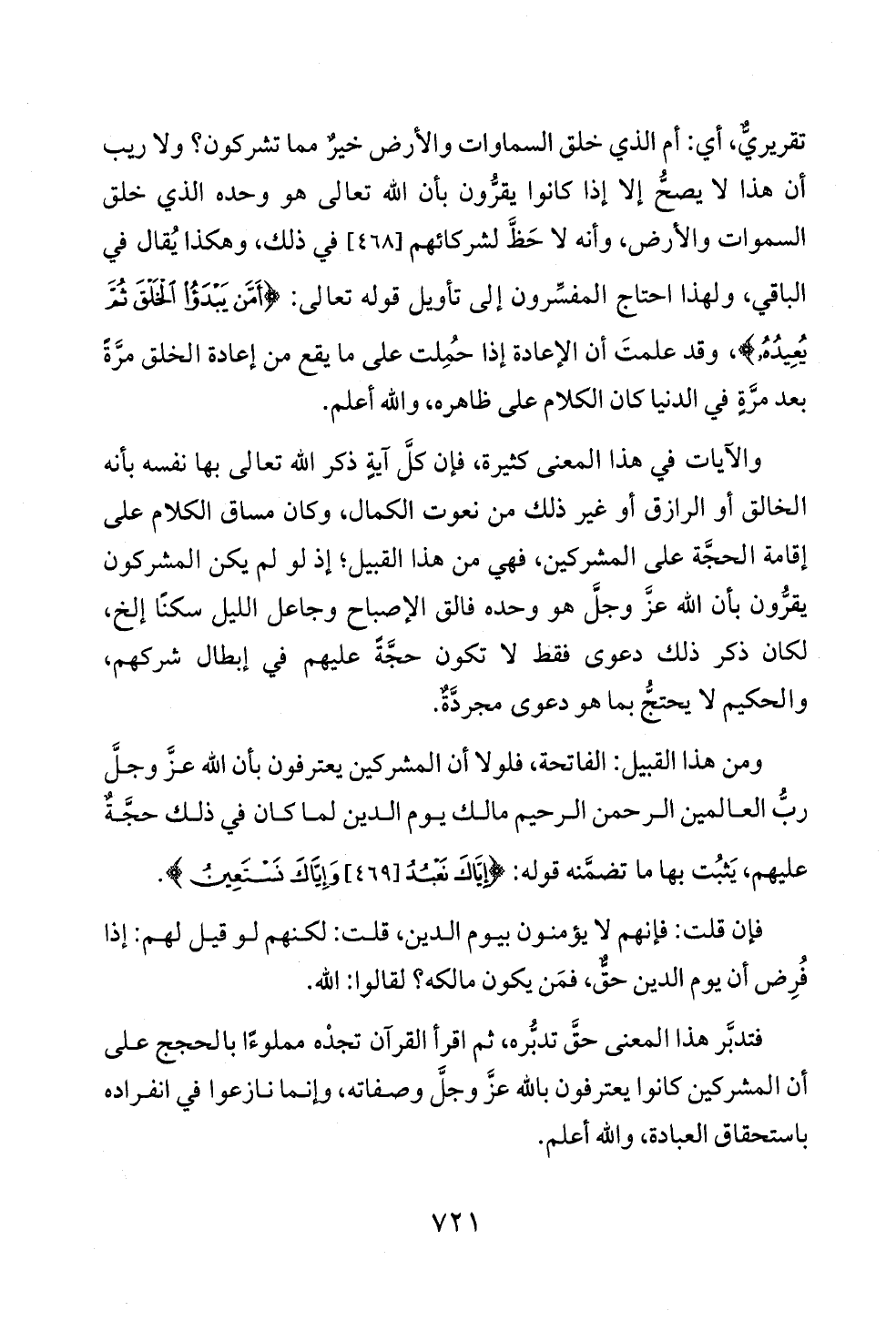 ومن هذا القبيل: الفاتحة، فلولا أن المشركين يعترفون بأن الله عزَّ وجلَّ ربُّ العالمين الرحمن الرحيم مالك يوم الدين لما كان في ذلك حجَّةٌ عليهم، يَثبُت بها ما تضمَّنه قوله: {إِيَّاكَ نَعْبُدُ [٤٦٩] وَإِيَّاكَ نَسْتَعِينُ}.