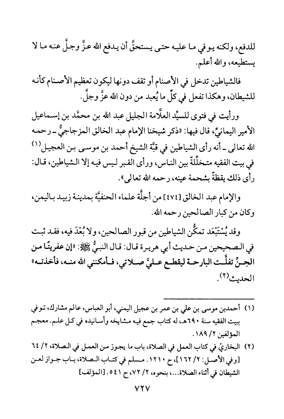 (¬٢) البخاريّ في كتاب العمل في الصلاة، باب ما يجوز من العمل في الصلاة، ٢/ ٦٤ [وفي الأصل: ٢/ ١٦٢]، ح ١٢١٠. مسلم في كتاب الصلاة، باب جواز لعن الشيطان في أثناء الصلاة ... ، بنحوه، ٢/ ٧٢، ح ٥٤١. [المؤلف]
