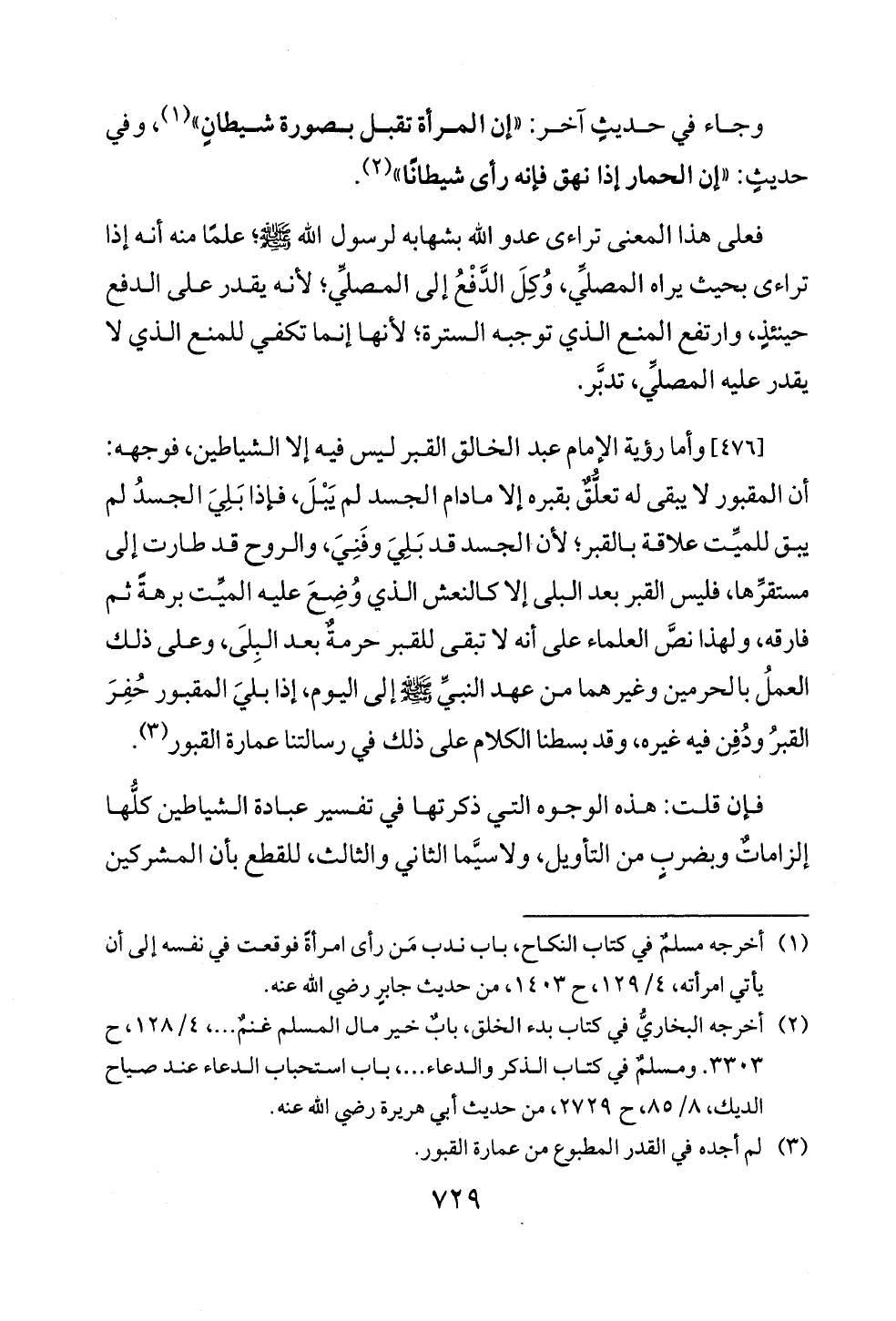 [٤٧٦] وأما رؤية الإمام عبد الخالق القبر ليس فيه إلا الشياطين، فوجهه: أن المقبور لا يبقى له تعلُّقٌ بقبره إلا مادام الجسد لم يَبْلَ، فإذا بَلِيَ الجسدُ لم يبق للميِّت علاقة بالقبر؛ لأن الجسد قد بَلِيَ وفَنِيَ، والروح قد طارت إلى مستقرِّها، فليس القبر بعد البلى إلا كالنعش الذي وُضِعَ عليه الميِّت برهةً ثم فارقه، ولهذا نصَّ العلماء على أنه لا تبقى للقبر حرمةٌ بعد البِلَى، وعلى ذلك العملُ بالحرمين وغيرهما من عهد النبيِّ - صلى الله عليه وسلم - إلى اليوم، إذا بليَ المقبور حُفِرَ القبرُ ودُفِن فيه غيره، وقد بسطنا الكلام على ذلك في رسالتنا عمارة القبور (¬٣).