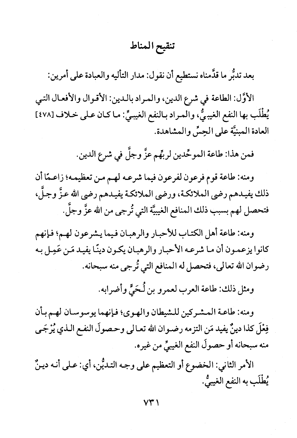 الأوَّل: الطاعة في شرع الدين، والمراد بالدين: الأقوال والأفعال التي يُطْلَب بها النفع الغيبيُّ، والمراد بالنفع الغيبيِّ: ما كان على خلاف [٤٧٨] العادة المبنيَّة على الحِسِّ والمشاهدة.