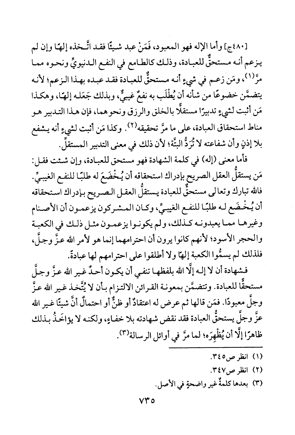 [٤٨٠ ج] وأما الإله فهو المعبود، فَمَنْ عبد شيئًا فقد اتَّخذه إلهًا وإن لم يزعم أنه مستحقٌّ للعبادة، وذلك كالطامع في النفع الدنيويِّ ونحوه مما مرَّ (¬١)، ومَن زعم في شيءٍ أنه مستحقٌّ للعبادة فقد عبده بهذا الزعم؛ لأنه يتضمَّن خضوعًا من شأنه أن يُطْلَب به نفعٌ غيبيٌّ، وبذلك جَعَله إلهًا، وهكذا مَن أثبت لشيءٍ تدبيرًا مستقلًّا بالخلق والرزق ونحوهما، فإن هذا التدبير هو مناط استحقاق العبادة, على ما مرَّ تحقيقه (¬٢). وكذا مَن أثبت لشيءٍ أنه يشفع بلا إذنٍ وأن شفاعته لا تُرَدُّ البتَّة؛ لأن ذلك في معنى التدبير المستقلِّ.