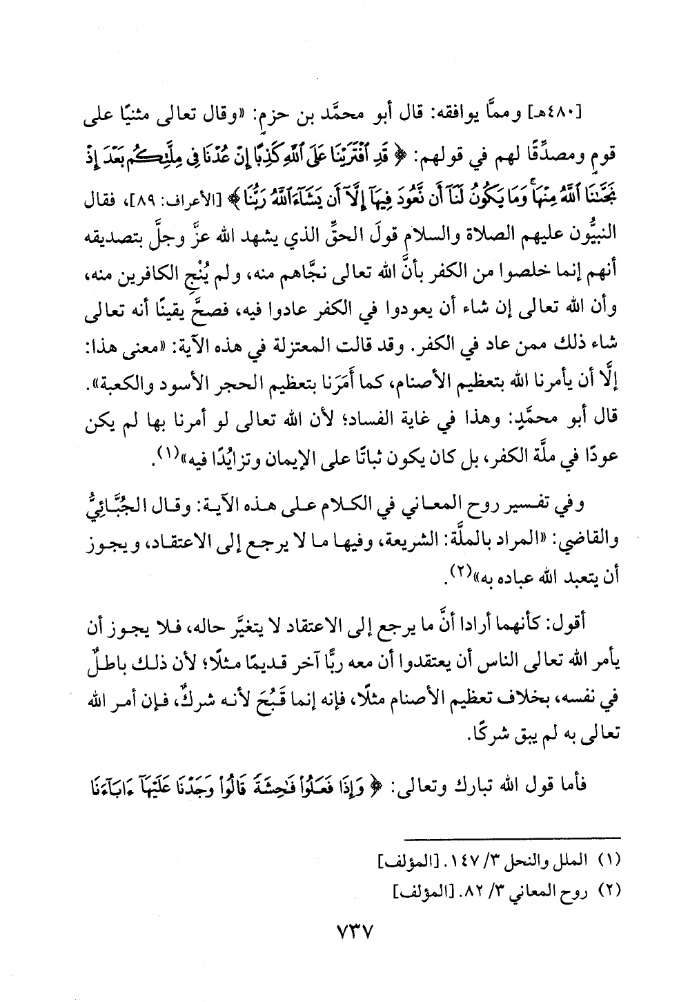 وفي تفسير روح المعاني في الكلام على هذه الآية: وقال الجُبَّائِيُّ والقاضي: «المراد بالملَّة: الشريعة، وفيها ما لا يرجع إلى الاعتقاد، ويجوز أن يتعبد الله عباده به» (¬٢).