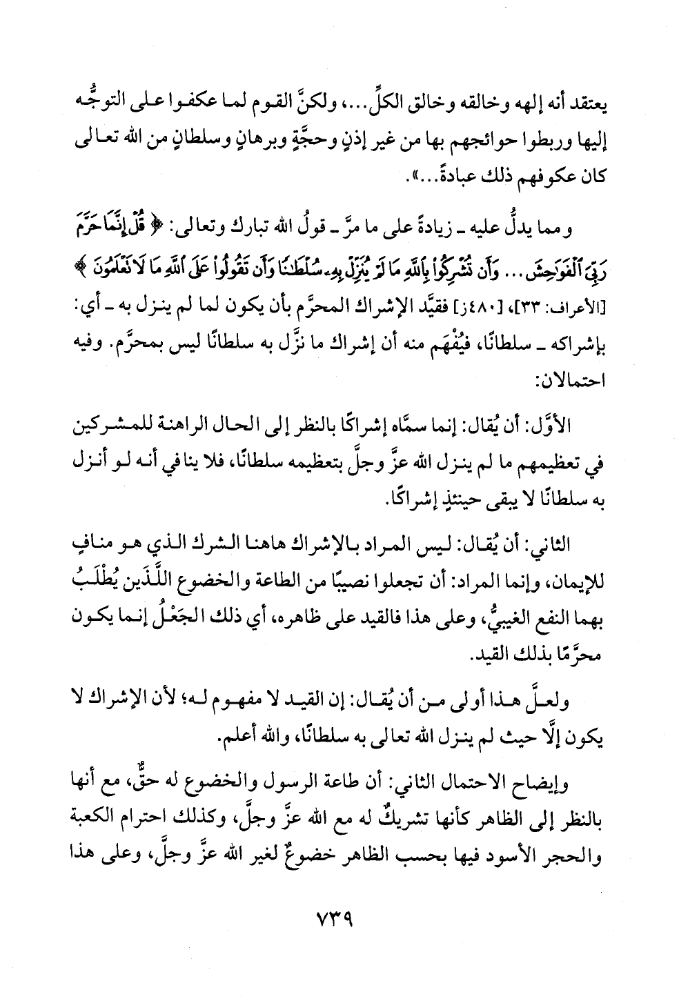 ومما يدلُّ عليه ــ زيادةً على ما مرَّ ــ قولُ الله تبارك وتعالى: {قُلْ إِنَّمَا حَرَّمَ رَبِّيَ الْفَوَاحِشَ ... وَأَنْ تُشْرِكُوا بِاللَّهِ مَا لَمْ يُنَزِّلْ بِهِ سُلْطَانًا وَأَنْ تَقُولُوا عَلَى اللَّهِ مَا لَا تَعْلَمُونَ} [الأعراف: ٣٣]، [٤٨٠ ز] فقيَّد الإشراك المحرَّم بأن يكون لما لم ينزل به ــ أي: بإشراكه ــ سلطانًا، فيُفْهَم منه أن إشراك ما نزَّل به سلطانًا ليس بمحرَّم. وفيه احتمالان: