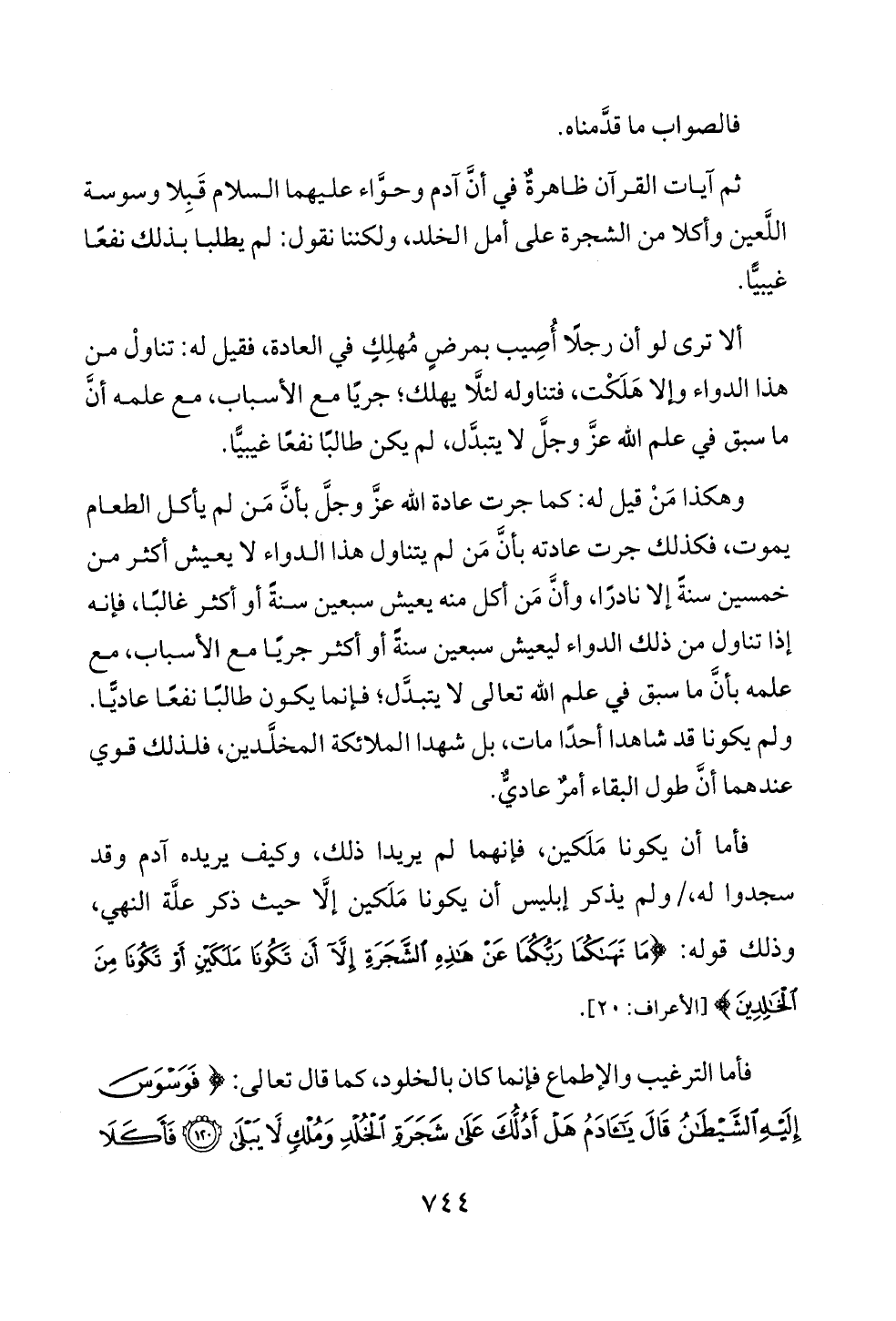 ثم آيات القرآن ظاهرةٌ في أنَّ آدم وحوَّاء عليهما السلام قَبِلا وسوسة اللَّعين وأكلا من الشجرة على أمل الخلد، ولكننا نقول: لم يطلبا بذلك نفعًا غيبيًّا.