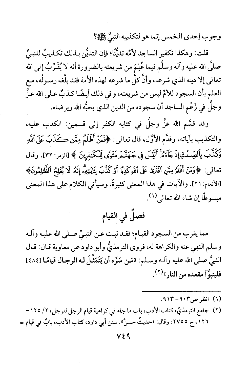 قلت: وهكذا تكفير الساجد لأمِّه تديُّنًا؛ فإن التديُّن بذلك تكذيبٌ للنبيِّ صلَّى الله عليه وآله وسلَّم فيما عُلِمَ من شريعته بالضرورة أنه لا يُقَرِّبُ إلى الله تعالى إلا دينه الذي شرعه، وأنَّ كلَّ ما شرعه لهذه الأمة فقد بلَّغه رسولُه، مع العلم بأن السجود للأمِّ ليس من شريعته، وفي ذلك أيضًا كذبٌ على الله عزَّ وجلَّ في زَعْمِ الساجد أن سجوده من الدين الذي يحبُّه الله ويرضاه.
