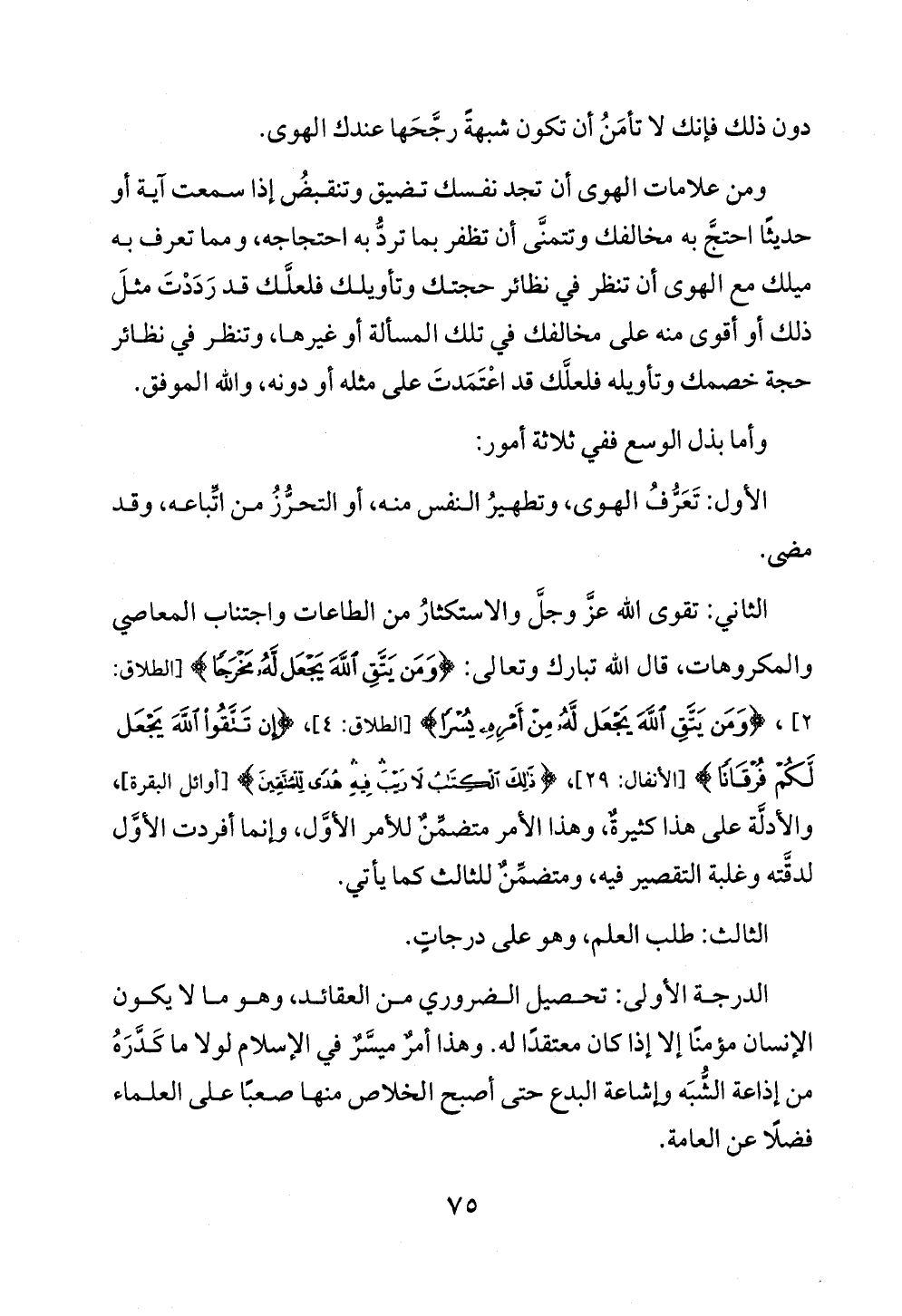 الثاني: تقوى الله عزَّ وجلَّ والاستكثارُ من الطاعات واجتناب المعاصي والمكروهات، قال الله تبارك وتعالى: {وَمَنْ يَتَّقِ اللَّهَ يَجْعَلْ لَهُ مَخْرَجًا} [الطلاق: ٢]، {وَمَنْ يَتَّقِ اللَّهَ يَجْعَلْ لَهُ مِنْ أَمْرِهِ يُسْرًا} [الطلاق: ٤]، {إِنْ تَتَّقُوا اللَّهَ يَجْعَلْ لَكُمْ فُرْقَانًا} [الأنفال: ٢٩]، {ذَلِكَ الْكِتَابُ لَا رَيْبَ فِيهِ هُدًى لِلْمُتَّقِينَ} [أوائل البقرة]، والأدلَّة على هذا كثيرةٌ، وهذا الأمر متضمِّنٌ للأمر الأوَّل، وإنما أفردت الأوَّل لدقَّته وغلبة التقصير فيه، ومتضمِّنٌ للثالث كما يأتي.