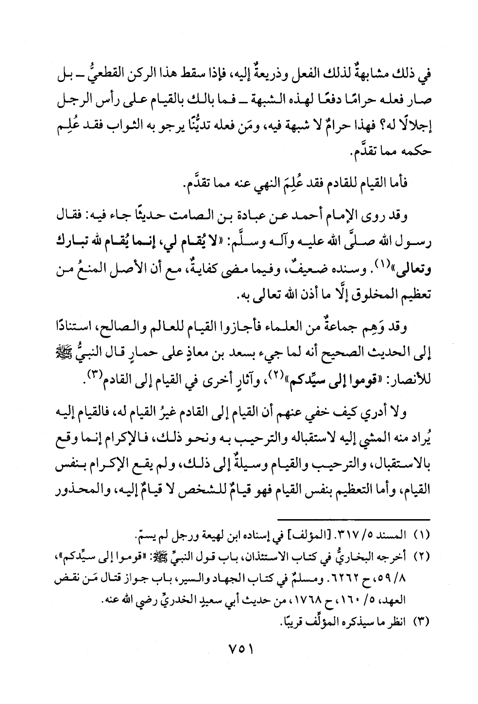 وقد روى الإمام أحمد عن عبادة بن الصامت حديثًا جاء فيه: فقال رسول الله صلَّى الله عليه وآله وسلَّم: «لا يُقام لي، إنما يُقام لله تبارك وتعالى» (¬١). وسنده ضعيفٌ، وفيما مضى كفايةٌ، مع أن الأصل المنعُ من تعظيم المخلوق إلَّا ما أذن الله تعالى به.