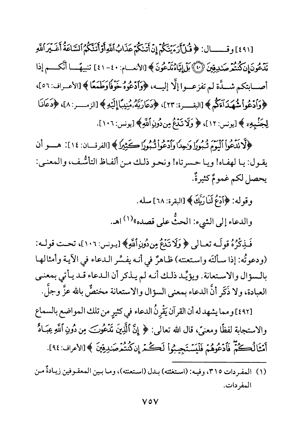 [٤٩١] وقال: {قُلْ أَرَأَيْتَكُمْ إِنْ أَتَاكُمْ عَذَابُ اللَّهِ أَوْ أَتَتْكُمُ السَّاعَةُ أَغَيْرَ اللَّهِ تَدْعُونَ إِنْ كُنْتُمْ صَادِقِينَ (٤٠) بَلْ إِيَّاهُ تَدْعُونَ} [الأنعام: ٤٠ - ٤١] تنبيهًا أنَّكم إذا أصابتكم شدَّة لم تفزعوا إلَّا إليه, {وَادْعُوهُ خَوْفًا وَطَمَعًا} [الأعراف: ٥٦] , {وَادْعُوا شُهَدَاءَكُمْ} [البقرة: ٢٣] , {دَعَا رَبَّهُ مُنِيبًا إِلَيْهِ} [الزمر: ٨] , {دَعَانَا لِجَنْبِهِ} [يونس: ١٢] , {وَلَا تَدْعُ مِنْ دُونِ اللَّهِ} [يونس: ١٠٦].