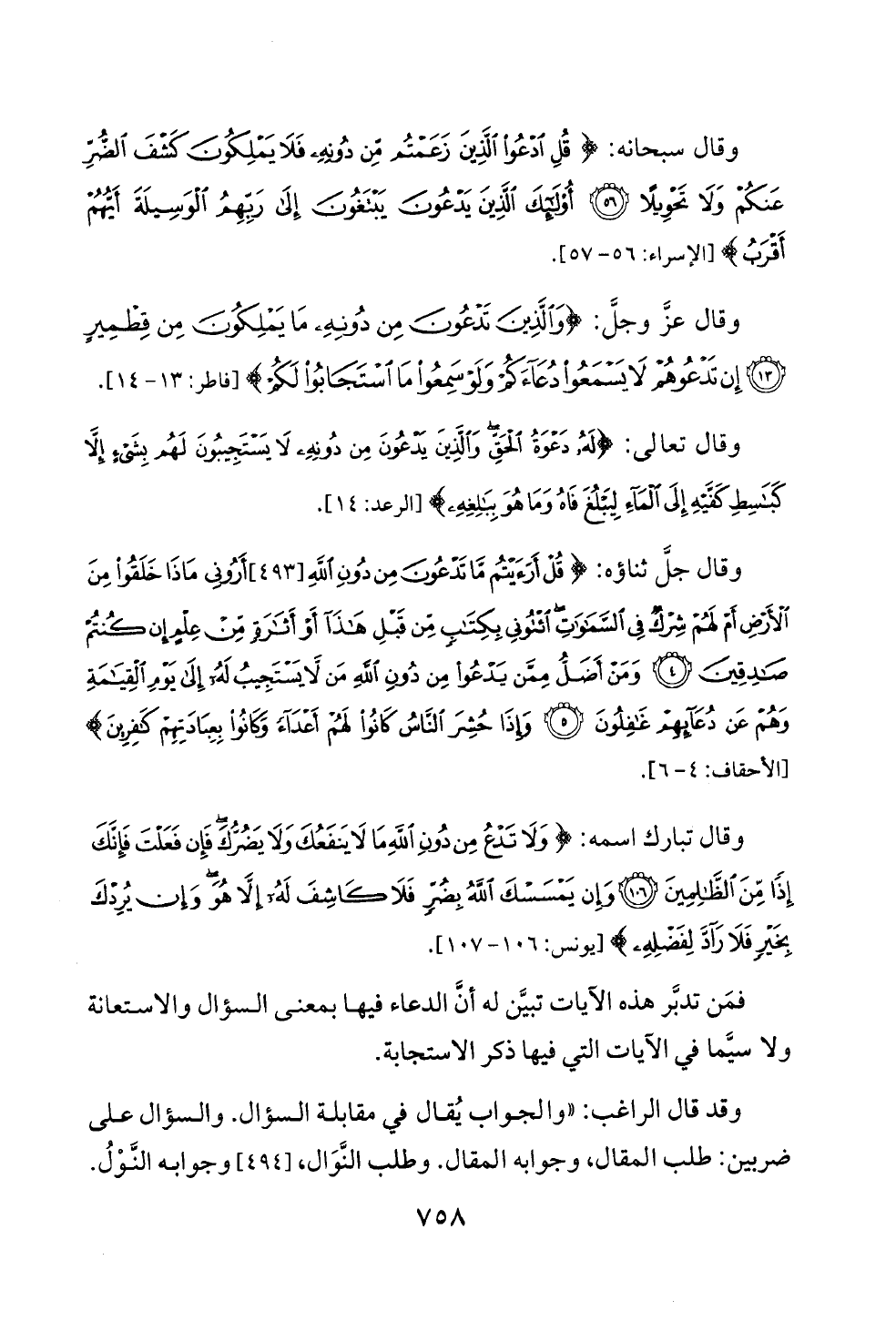 وقال جلَّ ثناؤه: {قُلْ أَرَأَيْتُمْ مَا تَدْعُونَ مِنْ دُونِ اللَّهِ [٤٩٣] أَرُونِي مَاذَا خَلَقُوا مِنَ الْأَرْضِ أَمْ لَهُمْ شِرْكٌ فِي السَّمَاوَاتِ ائْتُونِي بِكِتَابٍ مِنْ قَبْلِ هَذَا أَوْ أَثَارَةٍ مِنْ عِلْمٍ إِنْ كُنْتُمْ صَادِقِينَ (٤) وَمَنْ أَضَلُّ مِمَّنْ يَدْعُو مِنْ دُونِ اللَّهِ مَنْ لَا يَسْتَجِيبُ لَهُ إِلَى يَوْمِ الْقِيَامَةِ وَهُمْ عَنْ دُعَائِهِمْ غَافِلُونَ (٥) وَإِذَا حُشِرَ النَّاسُ كَانُوا لَهُمْ أَعْدَاءً وَكَانُوا بِعِبَادَتِهِمْ كَافِرِينَ} [الأحقاف: ٤ - ٦].