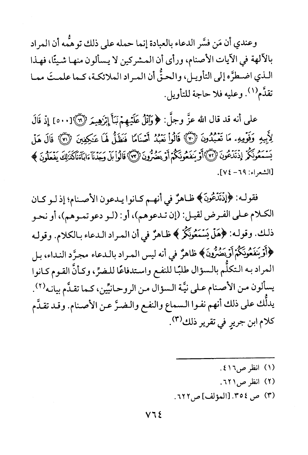 على أنه قد قال الله عزَّ وجلَّ: {وَاتْلُ عَلَيْهِمْ نَبَأَ إِبْرَاهِيمَ (٦٩) [٥٠٠] إِذْ قَالَ لِأَبِيهِ وَقَوْمِهِ مَا تَعْبُدُونَ (٧٠) قَالُوا نَعْبُدُ أَصْنَامًا فَنَظَلُّ لَهَا عَاكِفِينَ (٧١) قَالَ هَلْ يَسْمَعُونَكُمْ إِذْ تَدْعُونَ (٧٢) أَوْ يَنْفَعُونَكُمْ أَوْ يَضُرُّونَ (٧٣) قَالُوا بَلْ وَجَدْنَا آبَاءَنَا كَذَلِكَ يَفْعَلُونَ} [الشعراء: ٦٩ - ٧٤].