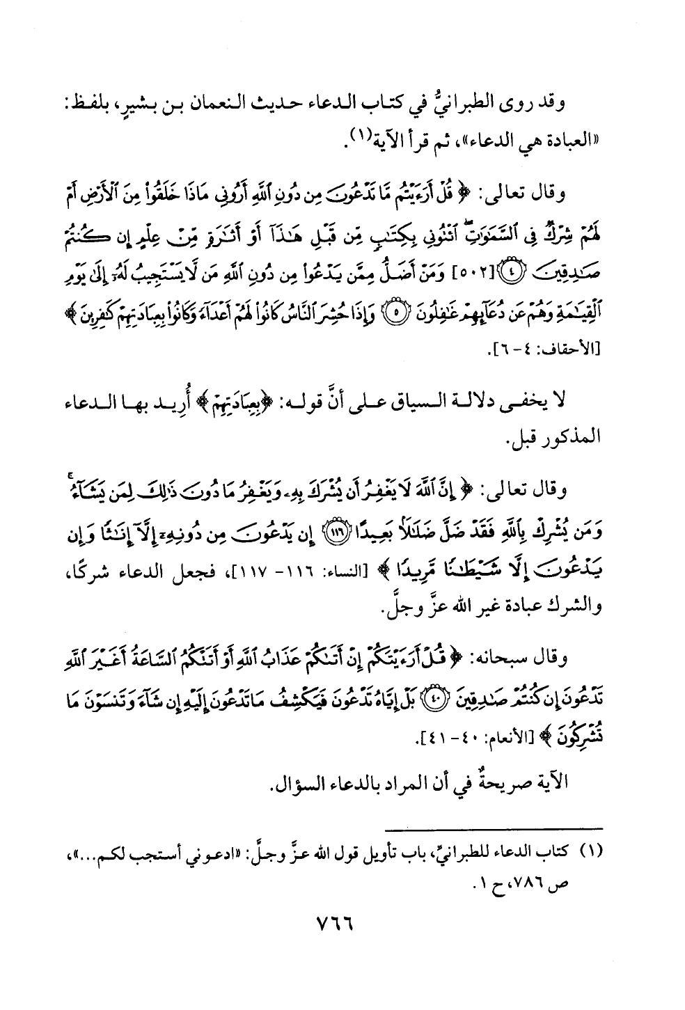 وقال تعالى: {إِنَّ اللَّهَ لَا يَغْفِرُ أَنْ يُشْرَكَ بِهِ وَيَغْفِرُ مَا دُونَ ذَلِكَ لِمَنْ يَشَاءُ وَمَنْ يُشْرِكْ بِاللَّهِ فَقَدْ ضَلَّ ضَلَالًا بَعِيدًا (١١٦) إِنْ يَدْعُونَ مِنْ دُونِهِ إِلَّا إِنَاثًا وَإِنْ يَدْعُونَ إِلَّا شَيْطَانًا مَرِيدًا} [النساء: ١١٦ - ١١٧] , فجعل الدعاء شركًا، والشرك عبادة غير الله عزَّ وجلَّ.
