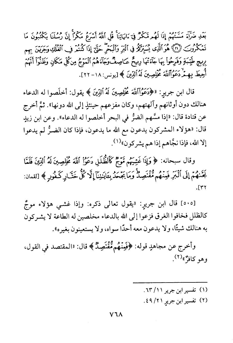[٥٠٥] قال ابن جريرٍ: «يقول تعالى ذكره: وإذا غشي هؤلاء موجٌ كالظلل فخافوا الغرق فزعوا إلى الله بالدعاء مخلصين له الطاعة لا يشركون به هنالك شيئًا، ولا يدعون معه أحدًا سواه، ولا يستعينون بغيره».