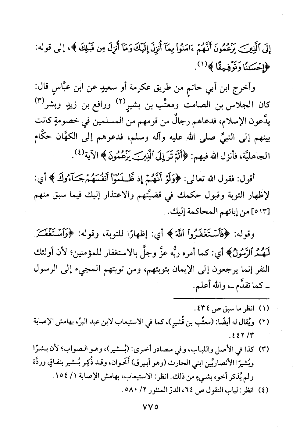 وأخرج ابن أبي حاتمٍ من طريق عكرمة أو سعيدٍ عن ابن عبَّاسٍ قال: كان الجلاس بن الصامت ومعتِّب بن بشيرٍ (¬٢) ورافع بن زيدٍ وبشر (¬٣) يدَّعون الإسلام، فدعاهم رجالٌ من قومهم من المسلمين في خصومةٍ كانت بينهم إلى النبيِّ صلى الله عليه وآله وسلم، فدعوهم إلى الكهَّان حكَّام الجاهليَّة، فأنزل الله فيهم: {أَلَمْ تَرَ إِلَى الَّذِينَ يَزْعُمُونَ} الآية (¬٤).