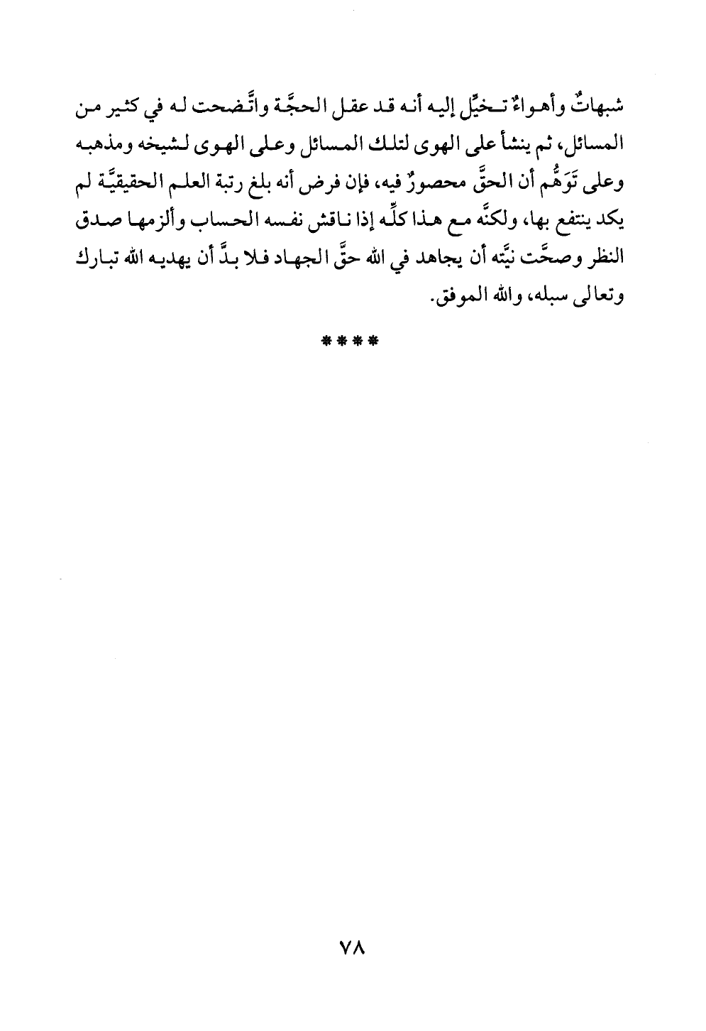 شبهاتٌ وأهواءٌ تخيِّل إليه أنه قد عقل الحجَّة واتَّضحت له في كثير من المسائل، ثم ينشأ على الهوى لتلك المسائل وعلى الهوى لشيخه ومذهبه وعلى تَوَهُّم أن الحقَّ محصورٌ فيه، فإن فرض أنه بلغ رتبة العلم الحقيقيَّة لم يكد ينتفع بها، ولكنَّه مع هذا كلِّه إذا ناقش نفسه الحساب وألزمها صدق النظر وصحَّت نيَّته أن يجاهد في الله حقَّ الجهاد فلا بدَّ أن يهديه الله تبارك وتعالى سبله، والله الموفق.