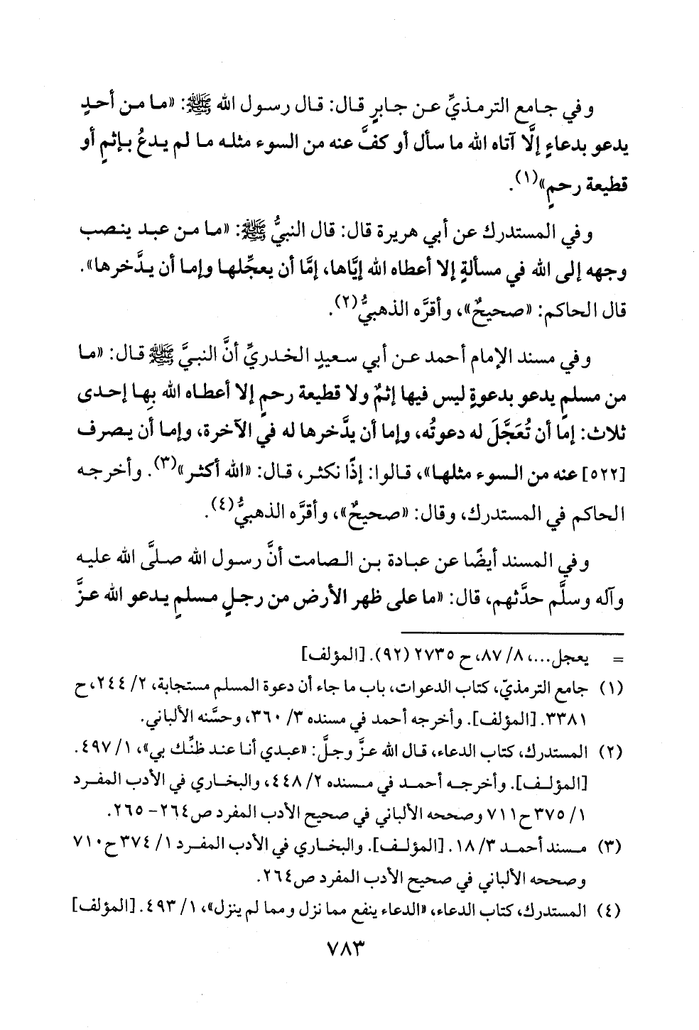 وفي جامع الترمذيِّ عن جابرٍ قال: قال رسول الله - صلى الله عليه وسلم -: «ما من أحدٍ يدعو بدعاءٍ إلَّا آتاه الله ما سأل أو كفَّ عنه من السوء مثله ما لم يدعُ بإثمٍ أو قطيعة رحمٍ» (¬١).