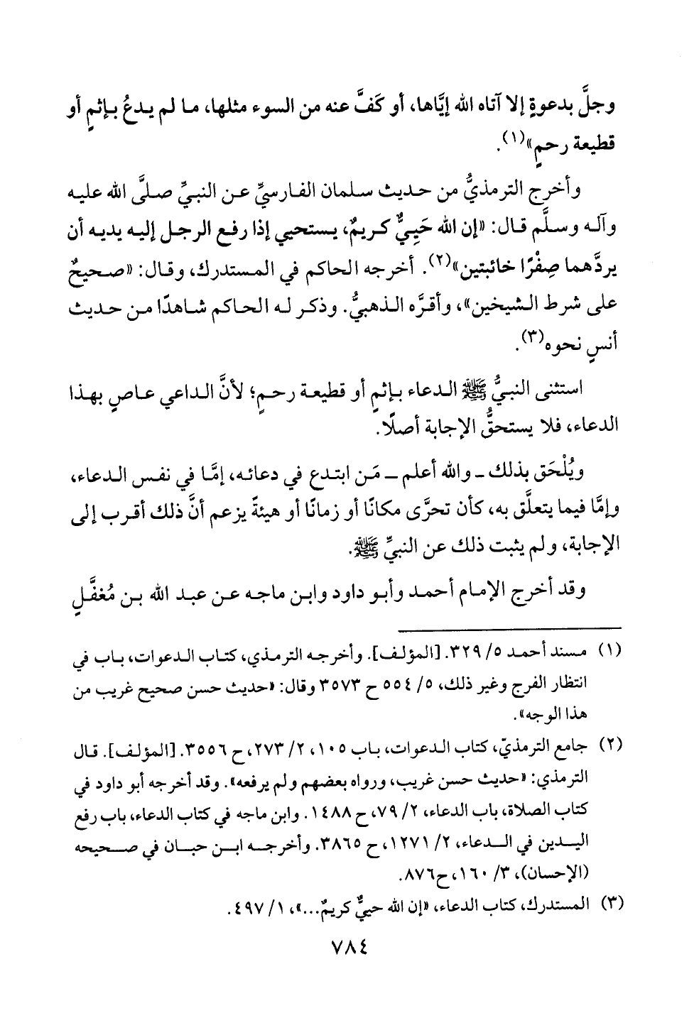 وأخرج الترمذيُّ من حديث سلمان الفارسيِّ عن النبيِّ صلَّى الله عليه وآله وسلَّم قال: «إن الله حَيِيٌّ كريمٌ، يستحيي إذا رفع الرجل إليه يديه أن يردَّهما صِفْرًا خائبتين» (¬٢). أخرجه الحاكم في المستدرك، وقال: «صحيحٌ على شرط الشيخين»، وأقرَّه الذهبيُّ. وذكر له الحاكم شاهدًا من حديث أنسٍ نحوه (¬٣).