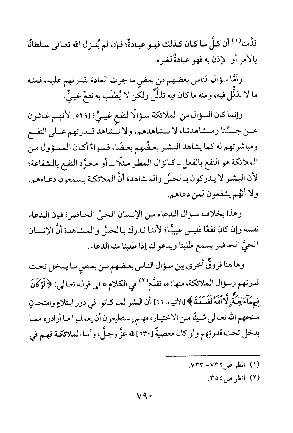 وإنما كان السؤال من الملائكة سؤالًا لنفعٍ غيبيٍّ؛ [٥٢٩] لأنهم غائبون عن حِسِّنا ومشاهدتنا، لا نشاهدهم، ولا نشاهد قدرتهم على النفع ومباشرتهم له كما يشاهد البشر بعضُهم بعضًا، فسواءٌ أكان المسؤول من الملائكة هو النفع بالفعل ــ كإنزال المطر مثلًا ــ أو مجرَّد النفع بالشفاعة؛ لأن البشر لا يدركون بالحسِّ والمشاهدة أنَّ الملائكة يسمعون دعاءهم، ولا أنَّهم يشفعون لمن دعاهم.