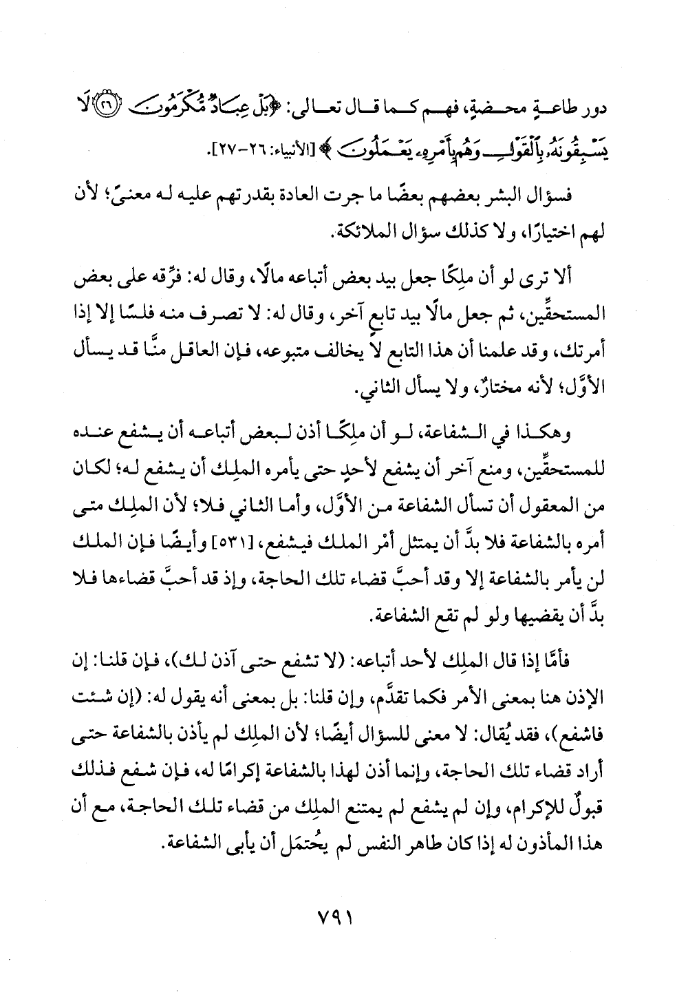 وهكذا في الشفاعة، لو أن ملِكًا أذن لبعض أتباعه أن يشفع عنده للمستحقِّين، ومنع آخر أن يشفع لأحدٍ حتى يأمره الملِك أن يشفع له؛ لكان من المعقول أن تسأل الشفاعة من الأوَّل، وأما الثاني فلا؛ لأن الملِك متى أمره بالشفاعة فلا بدَّ أن يمتثل أمْر الملك فيشفع، [٥٣١] وأيضًا فإن الملك لن يأمر بالشفاعة إلا وقد أحبَّ قضاء تلك الحاجة، وإذ قد أحبَّ قضاءها فلا بدَّ أن يقضيها ولو لم تقع الشفاعة.