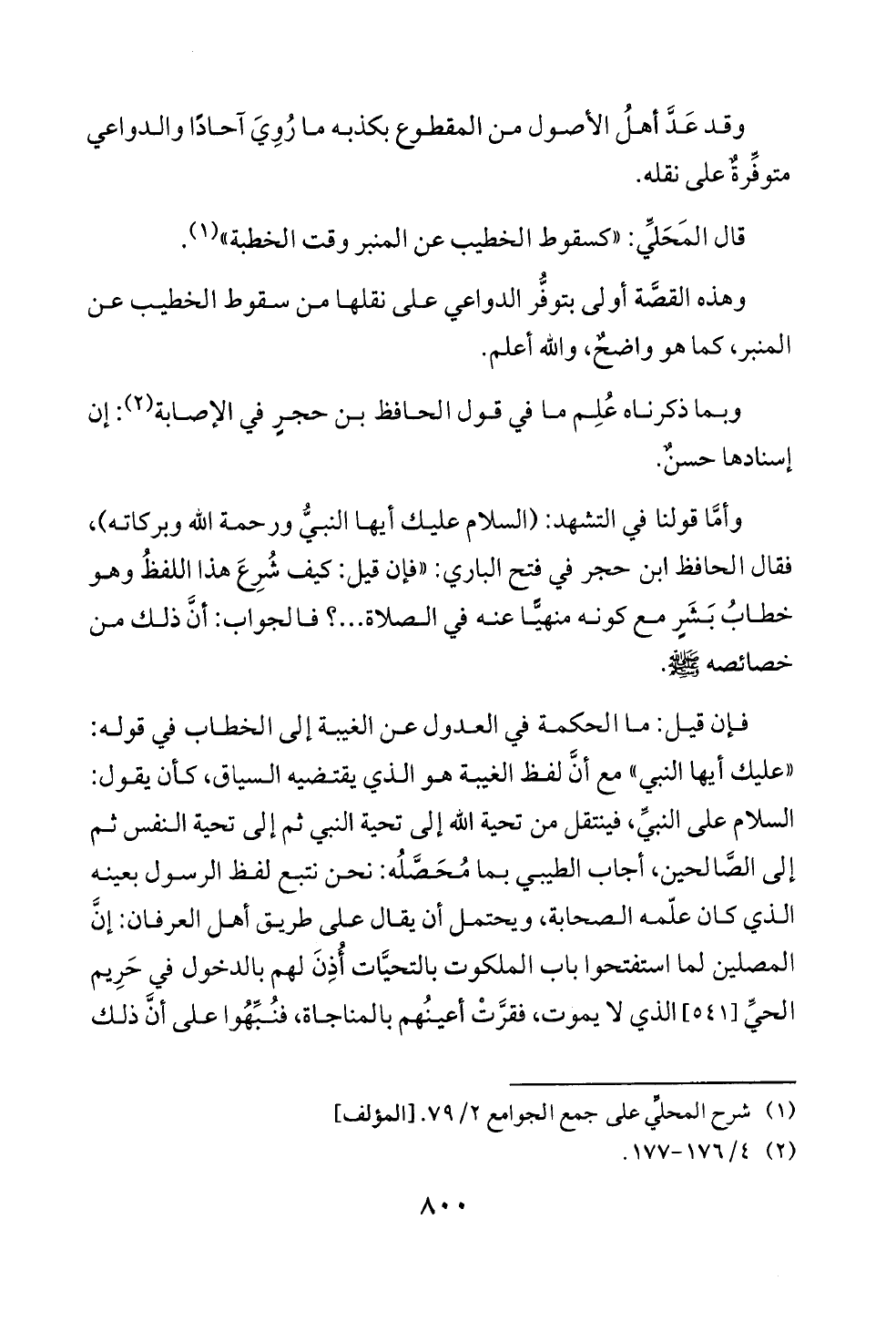 فإن قيل: ما الحكمة في العدول عن الغيبة إلى الخطاب في قوله: «عليك أيها النبي» مع أنَّ لفظ الغيبة هو الذي يقتضيه السياق، كأن يقول: السلام على النبيِّ، فينتقل من تحية الله إلى تحية النبي ثم إلى تحية النفس ثم إلى الصَّالحين، أجاب الطيبي بما مُحَصَّلُه: نحن نتبع لفظ الرسول بعينه الذي كان علّمه الصحابة، ويحتمل أن يقال على طريق أهل العرفان: إنَّ المصلين لما استفتحوا باب الملكوت بالتحيَّات أُذِنَ لهم بالدخول في حَرِيم الحيِّ [٥٤١] الذي لا يموت، فقرَّتْ أعينُهم بالمناجاة، فنُبِّهُوا على أنَّ ذلك
